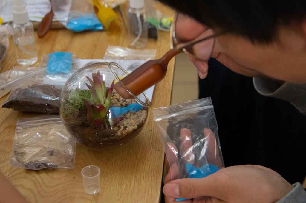 邀请资环院学生会以“瓶纳百川,共护生态”为主题于荟七三楼活动室展开生态瓶制作活动。“利用一包沙、几抔营养土、几株多肉等材料构建一个生态秘境是令人向往的”,活动在轻松愉快的氛围中开展,同学们在亲自动手装点搭配、制作生态瓶的同时,不仅详细了解了各种材料的作用,更学会了人工构建生态系统的相关知识。农学2001班王丹阳感慨道:“这次活动在让我感受到小小的生态瓶中蕴含着自然的深邃机理的同时,也令我的身心得到了放松。”
