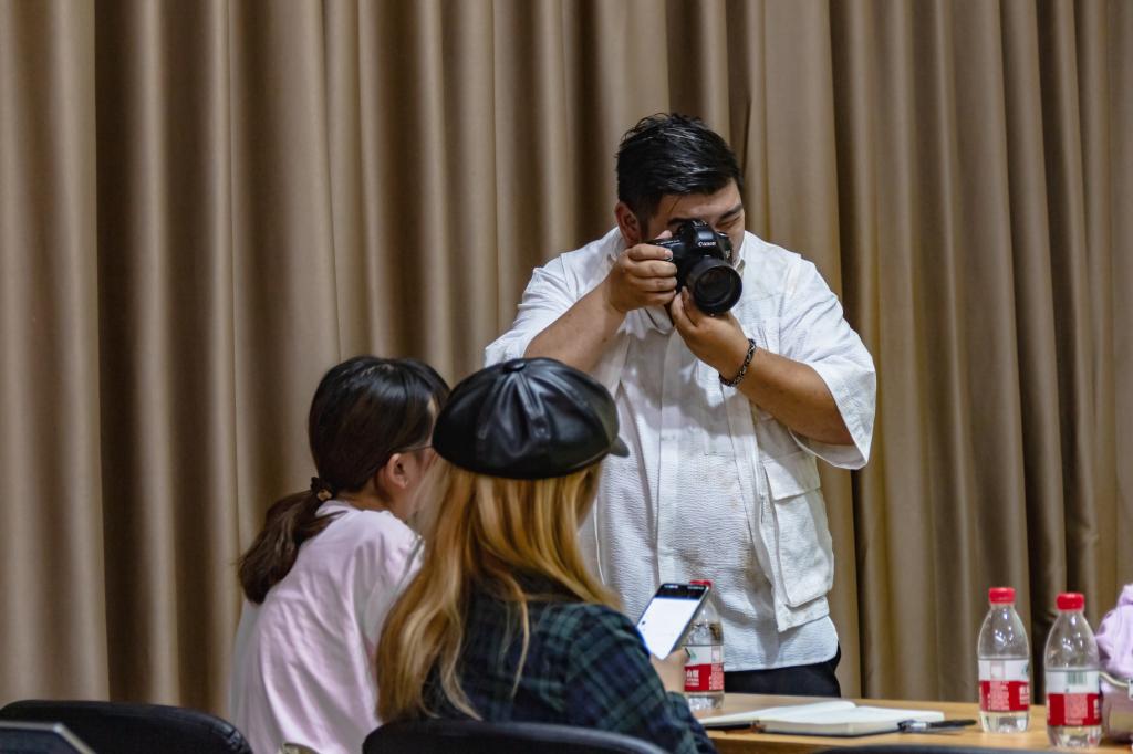 在教学“单反相机如何快速入手”时,易俊首先从微单和单反相机的区别开始讲解,然后让同学们拿出自己的相机,介绍基础拍摄操作和技巧。“我可以用相机把现在这个教室拍出空无一人的效果。”在讲到如何调节“快门”时,易俊让部分同学在教室走动起来,随后展示出拍摄的视频。他解释道:“画面定格效果与快门速度有关,快门速度越高,画面定格效果越好。”