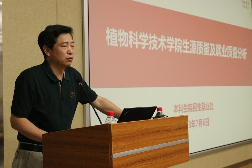 随后,杨道兵介绍了学校与学院的招生情况,他从招生计划、植物生产类专业生源、智慧农业专业生源进行了分析,同时对比了部分农科专业及相关专业,他指出,近三年农学第一专业志愿报考率和优质生源占比逐年提升。杨道兵通过分享近三年的各专业毕业去向落实率等具体指标对本科毕业生就业情况做了阐释,他倡议学院全体老师协同发力共同提升学生就业质量。