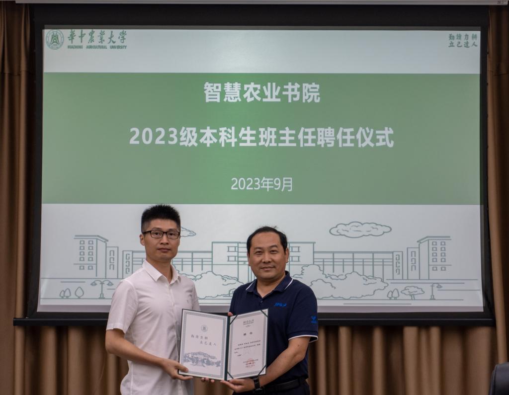 、智慧农业书院2023级本科生班主任聘任仪式暨培训交流会学院在三综B308召开,院长朱龙付,2023级本科生班主任、年级辅导员参会,会议由党委副书记孙超主持。