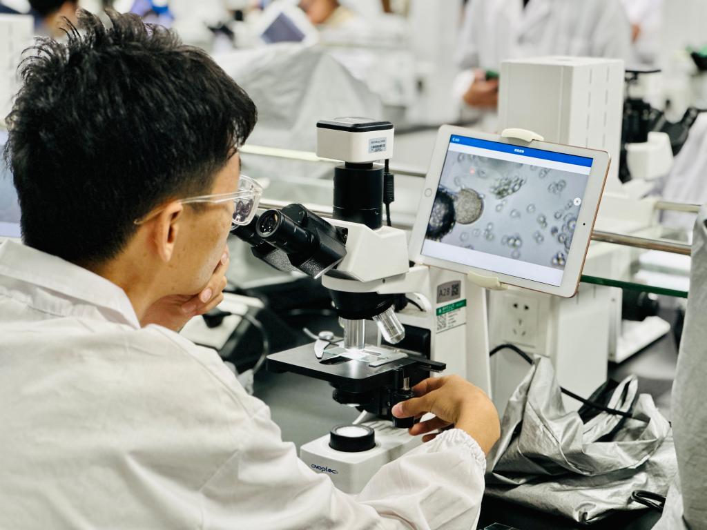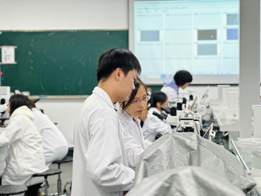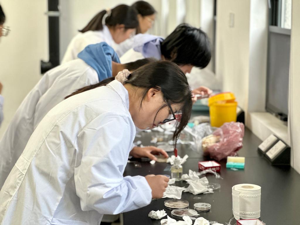 之后,肖雪琼讲解了标本切片的注意事项,同学们自己动手开展微生物制片实验。实验采用的材料有稻瘟菌、赤霉菌和灰葡萄孢等的丝状真菌,非丝状真菌酵母,以及真菌病害柑橘青霉病。同学们通过观察真菌的菌落,初步了解了丝状真菌和非丝状真菌的区别,并使用显微镜观察微生物结构。同时,通过对柑橘青霉病害症状观察和显微观察青霉分生孢子,同学们初步学习了鉴定真菌病害的方法。
