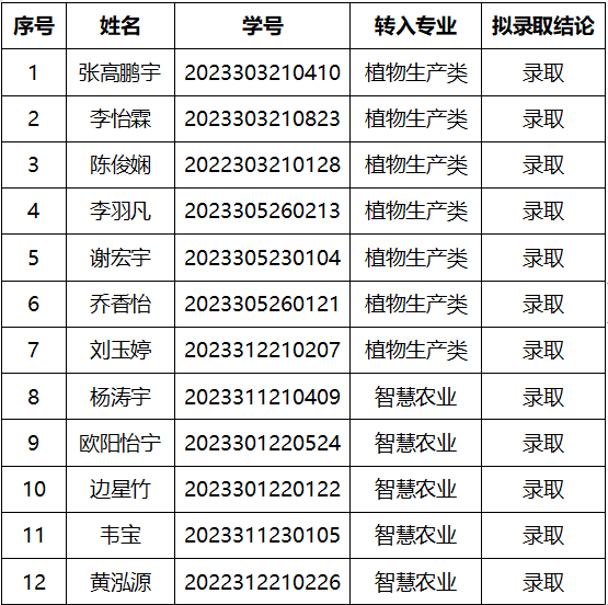 与智慧农业书院工作方案》,经学生自主申请,我院于2024年1月4日组织专家对学生的综合知识结构、思维能力、语言表达能力、个性品质等综合素质进行考核。根据考核结果及第一学年成绩GPA核算录取成绩后,拟录取张高鹏宇等12名学生进入2023级智慧农业或植物生产类专业学习,现将名单公示如下: