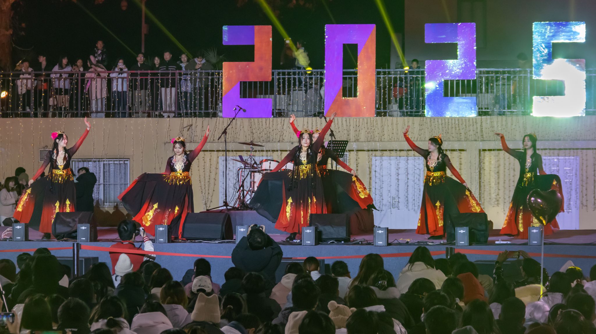 “在这欢乐的跨年时刻,我们邀请了藏族、维吾尔族、蒙古族、哈萨克族及汉族的同学,为大家呈现一场精彩的舞蹈盛宴。”“多元共舞,欢乐跨年” 项目负责人普布片多介绍道。舞台上,各民族特色舞蹈轮番登场,尽显独特文化魅力。活动还设置互动环节,邀请观众上台学习民族舞蹈动作,一同分享欢乐。在所有民族舞蹈结束后,全体参演同学共同演绎《美丽中国》,各民族学生代表上台用本民族语言向全校师生送上新年祝福,为活动画上圆满句号。