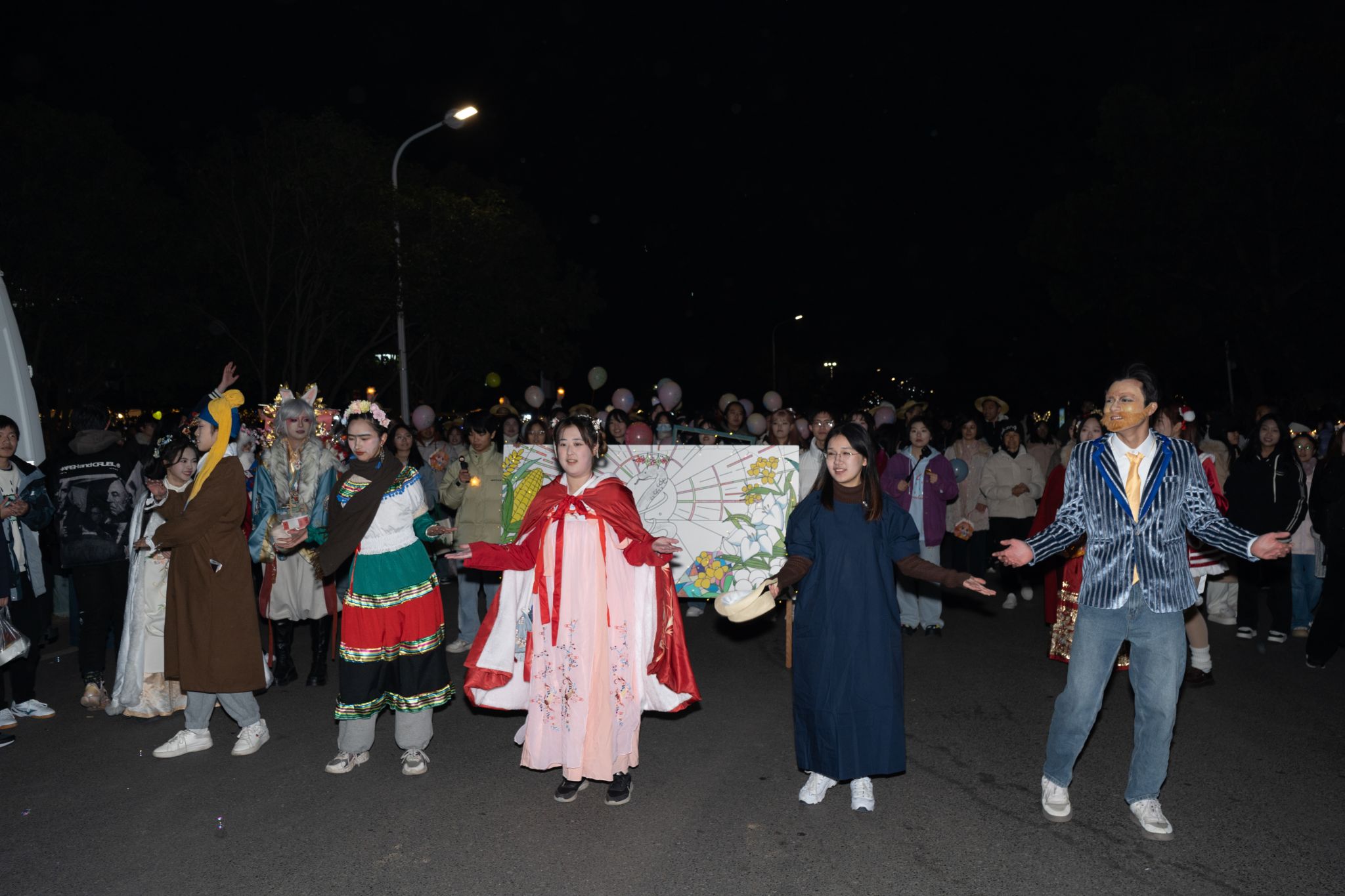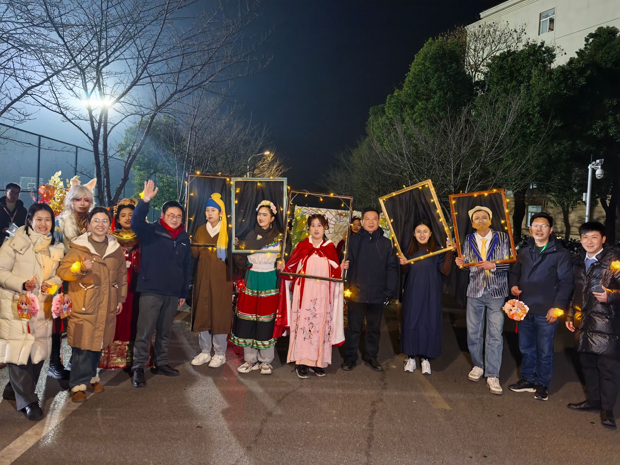 伴随欢快的鼓乐声,学院 “画中世界”—— 世界名画巡游拉开帷幕。百余名师生依据世界名画精心装扮,身着相应服饰、手持特色道具,模仿画中人物与路人热情互动,这场巡游宛如一场穿越时空的艺术之旅,共同绘就世界文化的多彩长卷。