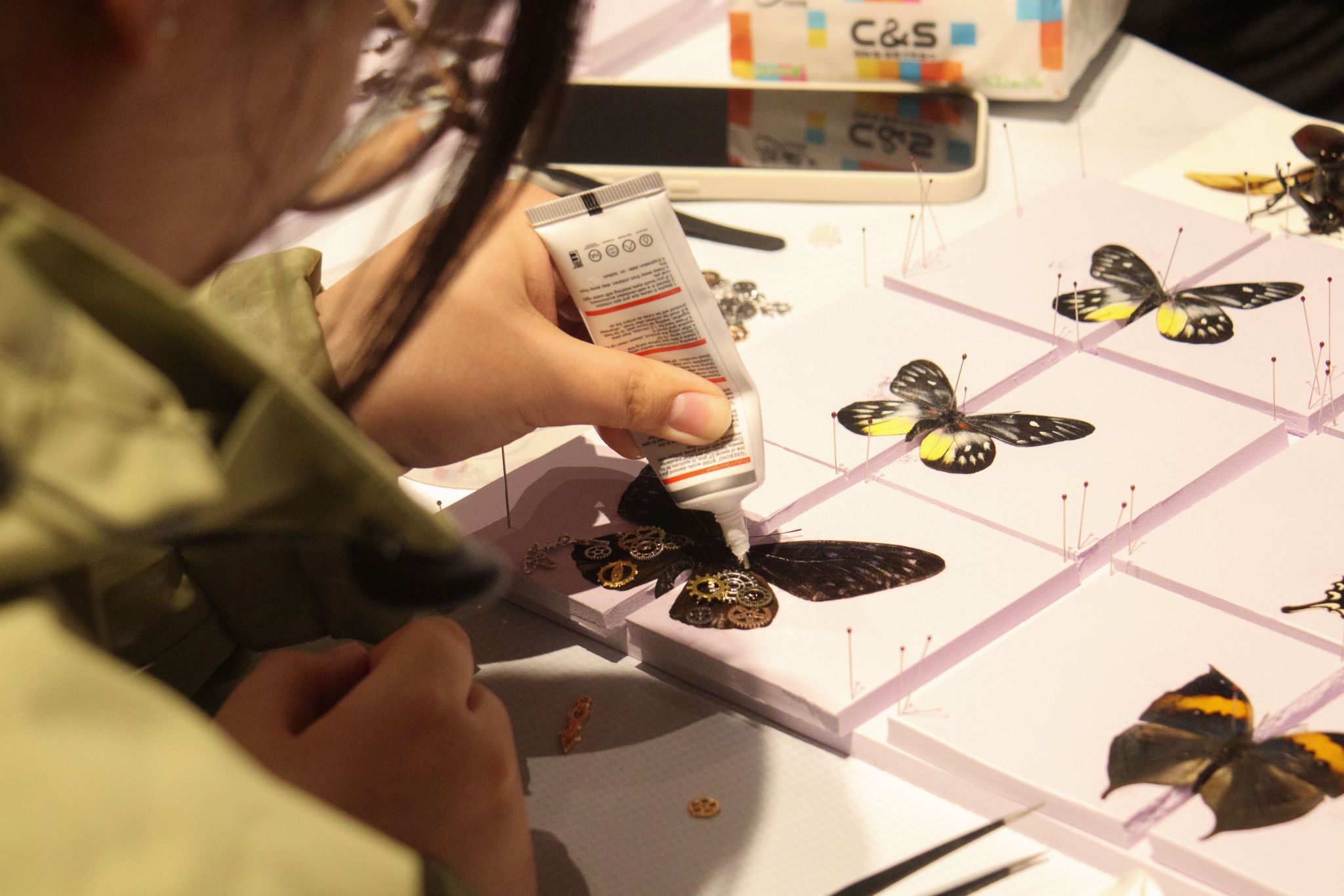 步入集市,“种情画艺” 摊位人气颇高,同学们挑选植物种子与五谷杂粮,通过粘、贴、拼、雕等手法创作精美的种子画,作品既彰显学科特色,又寓意新年五谷丰登,创意与祝福满溢。“相遇非遗・蟲语自然” 摊位同样引人注目,这里将中华传统非遗通草花与精选昆虫巧妙融合,打造出独一无二的艺术品,每一件都凝聚着匠人的心血,承载着对传统文化的敬意。