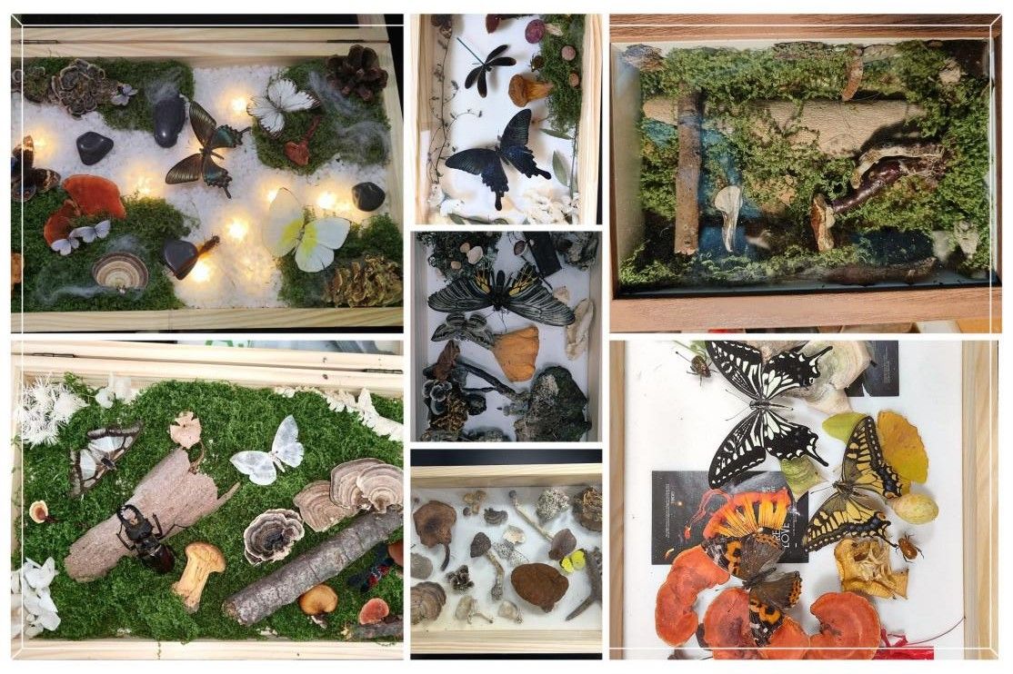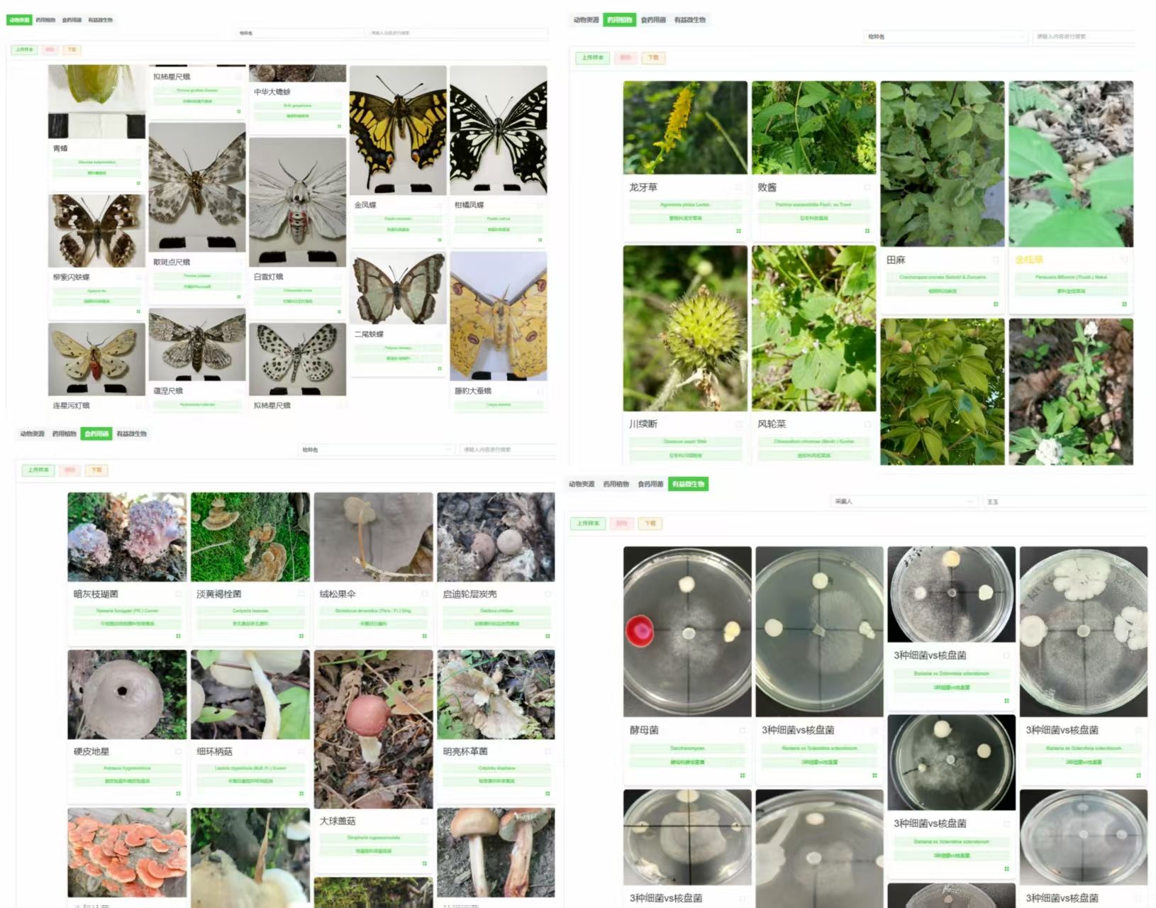 依托《应用生物科学专业基础实习》数字化课程教改项目,本次课程组新建了一个应用生物专业本科生实习在线互动系统,并在今年成功投入使用(图7)。该实习互动系统主要用来协助学生上传和保存动物、药用植物、食药用菌、有益微生物等四大类生物资源标本照片,并兼具编辑、检索、分享、下载等多项功能,可生动展示采集物种的信息,并推动生物资源标本信息数字化沉淀。实习结束之际,学生们精心制作了实习成果展板,并将该展板和部分昆虫标本留在了神农架科技创新中心,供中心对外开展科普活动使用(图8)。
