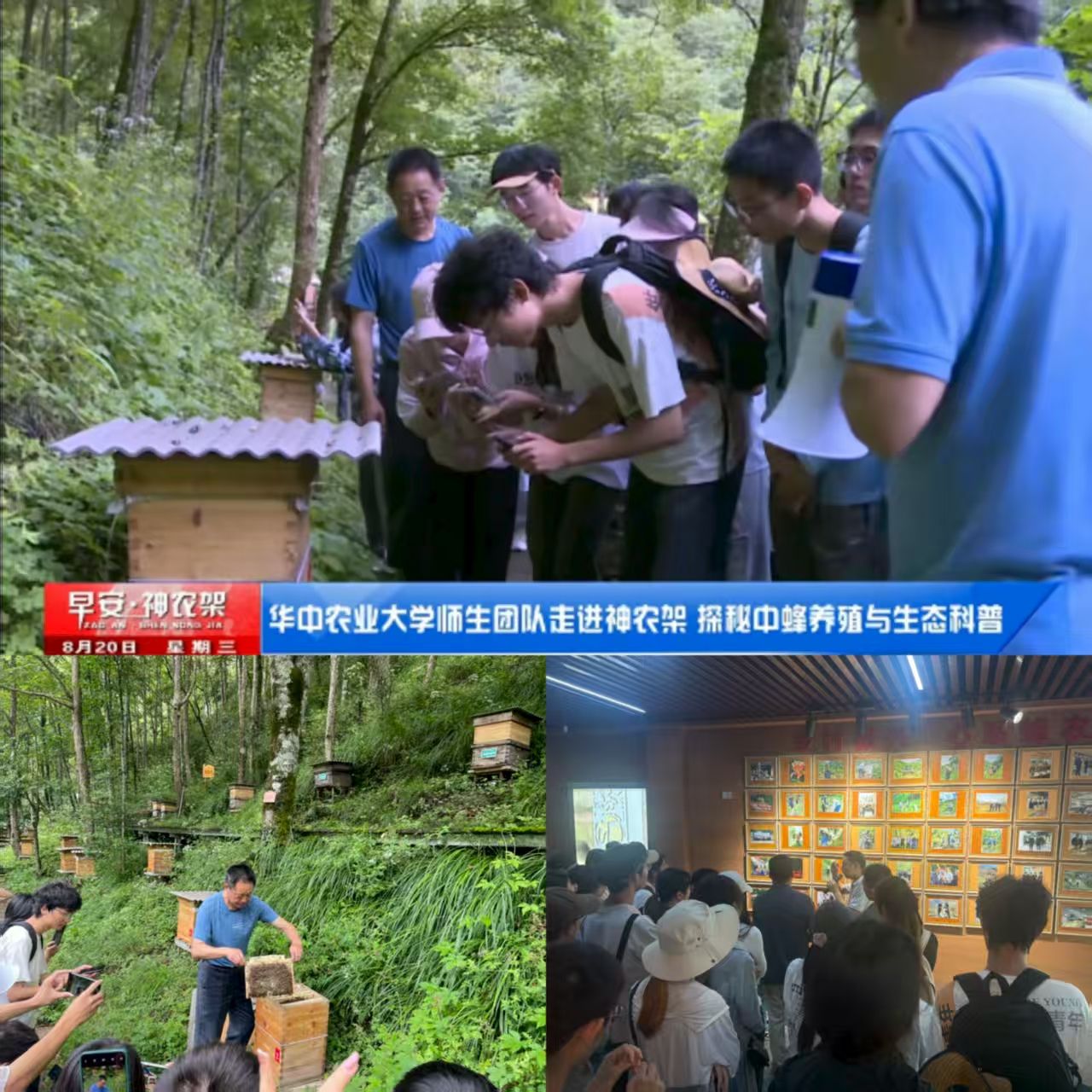在神农架中蜂保护和繁育基地,同学们参观了岩壁上和林下蜂箱,当地养殖师傅打开蜂箱展示了蜂巢内部结构,并在展厅详细讲解了蜜蜂勤劳的一生。值得一提的是,此次在神农架中蜂保护和繁育基地的参观学习活动,还得到了《神农架新闻》的关注与官方报道(图4)。在神农架汇野生态食品有限公司,同学们依次参观了文化展示区、传统养殖用具展示区与参观品尝区,实现了对“神农百花蜜”从认知到深度体验的过渡(图4)。