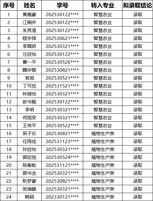 与智慧农业书院工作方案》,经学生自主申请,我院于2025年12月27日组织专家对学生的综合知识结构、思维能力、语言表达能力、个性品质等综合素质进行考核。根据考核结果及第一学年成绩GPA核算录取成绩后,拟录取黄嘉豪等24名学生进入2025级智慧农业或2025级植物生产类专业学习,现将名单公示如下:
