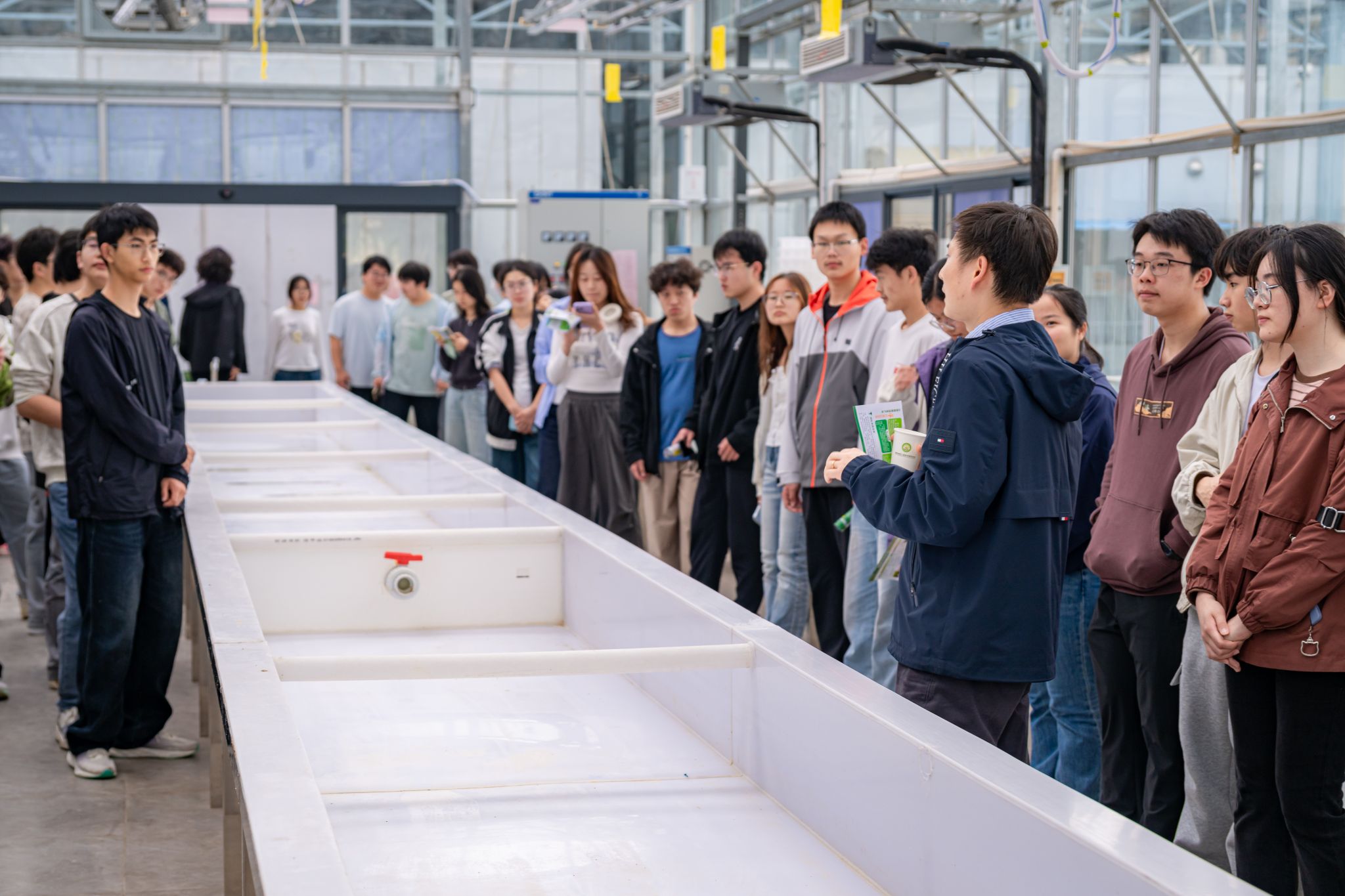 随后,赵虎、何菡子老师带领学生走进温室基地,依次参观耐盐碱种质筛选创制平台、油菜快速育种平台。在智能温室中,同学们了解到通过精准调控春化、温度、光照等环境条件,可突破传统育种“一年一代”的限制,实现油菜一年3.5至5代的快速繁育,大幅提升育种效率。同学们通过近距离观察油菜大田栽培、温室培育与水培种植模式,深刻认识到科研设施对杂交育种与基础研究的重要支撑作用。