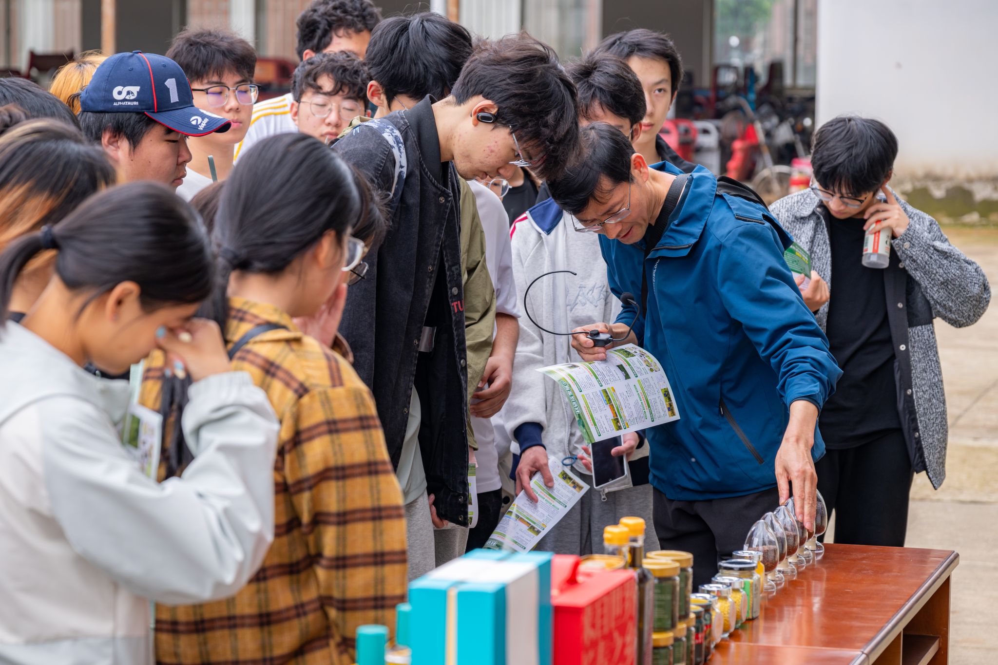 在互动与展示环节,葛贤宏老师以日常食用菜籽油为切入点与同学们交流,分发宣传资料,带领大家辨识不同油菜种子,品尝特色油菜蜂蜜水,并观看团队宣传片,全面了解团队20余年来承担国家重点研发计划、国家自然科学基金等重大项目的丰硕成果。同学们直观感受到,团队研究已覆盖油用、菜用、多功能利用等多种场景,兼具抗病毒、盐碱地修复等重要价值,真正实现从实验室到田间、从科研成果到民生产品的转化。
