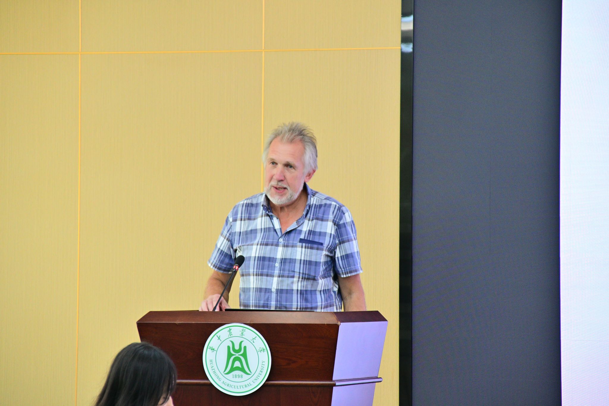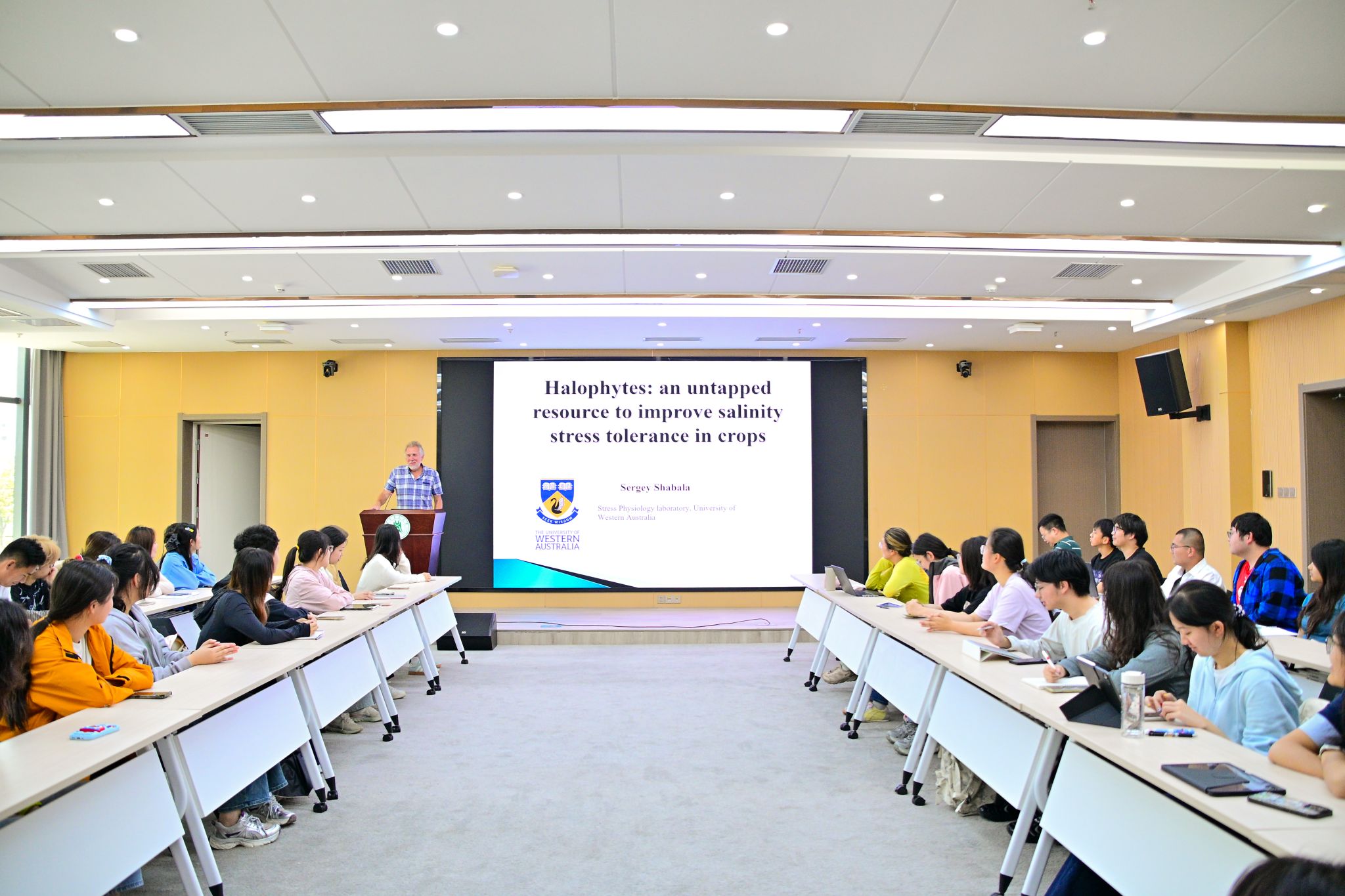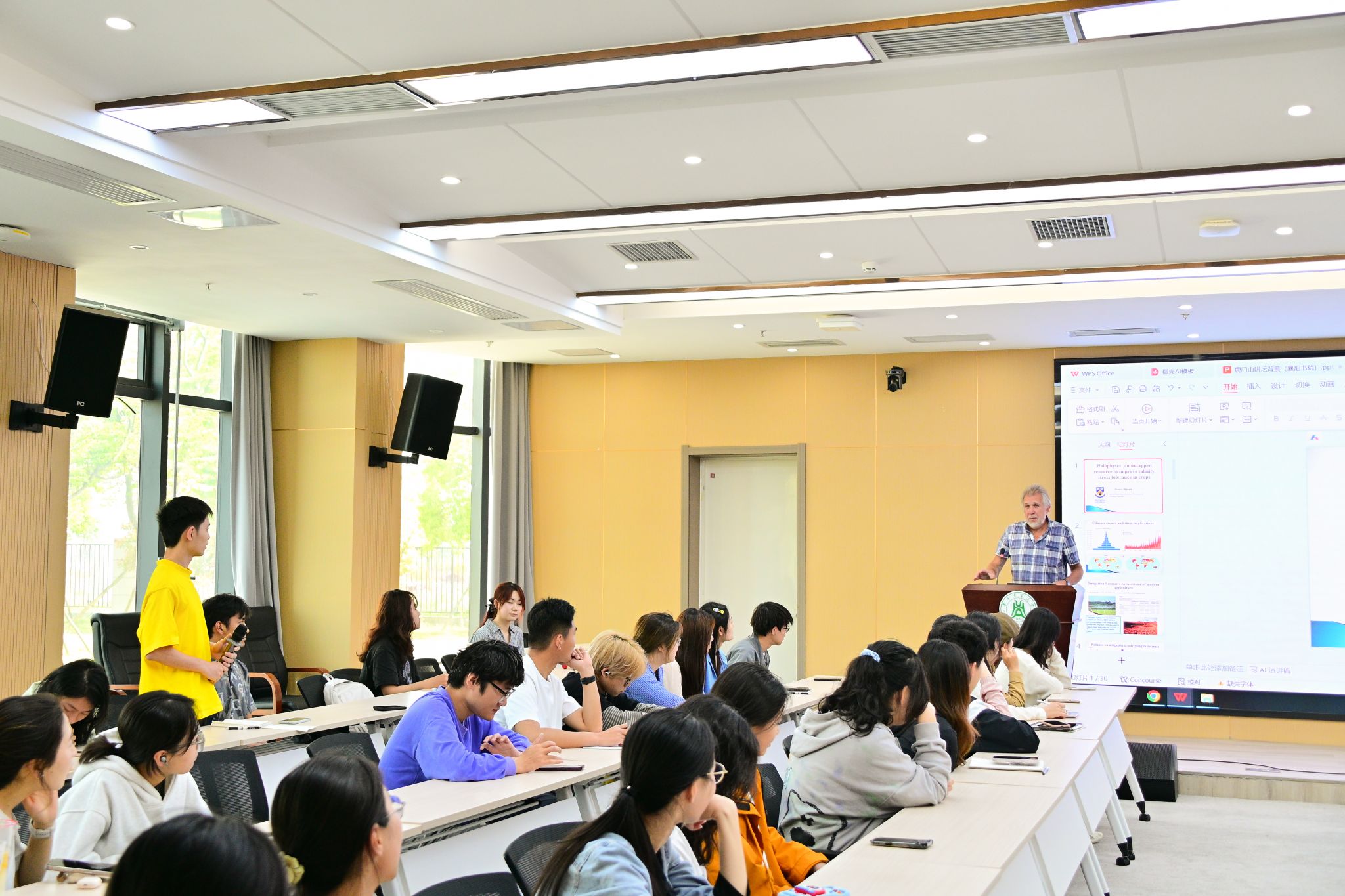 互动环节中,针对农学2401班刘昊坤“相较于传统作物耐盐改良方法,针对盐生植物研究的最大优势是什么”问题,Sergey Shabala回应:一方面,藜麦等部分盐生植物可直接作为粮食作物开发;另一方面,盐生植物中存在的耐盐基因或调控策略可以为作物耐盐性状改良提供参考。农学2401班郭书裕提出的“通过作物与盐生植物的基因整合提升作物耐盐性”“借助人工智能预测并设计新型通道蛋白来帮助植物应对逆境胁迫”设想,也得到了充分肯定。活动最后,智农2405班付琳恋围绕学科发展与学业规划发问,Sergey Shabala结合自身研究成果与行业前沿动态进行了细致解答。