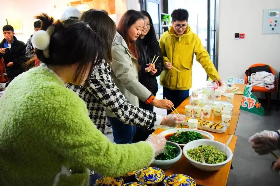“没想到油菜薹有这么多吃法。”狮山菜薹宴品鉴活动现场,同学们发出阵阵感叹。菜薹汁、菜薹炒饭、菜薹煎饼、菜薹粥、清炒菜薹等菜品齐上桌,同学们用舌尖体会春天的馈赠。这些由同学们亲手采摘的狮山菜薹不仅颜色翠绿鲜亮,吃起来更是鲜美多汁、爽脆可口。“菜薹汁形式创新,喝起来甘甜滋润,别有滋味。”师生品鉴后如是说。狮山菜薹是由油菜团队马朝芝教授等历经16年科研攻关,研发出的我国首个食用型油菜新品种,并获得了相关专利。“狮山菜薹钙含量与鲜牛奶相当,维C含量堪比猕猴桃,此外还富含多种营养元素。”马朝芝介绍,狮山菜薹作为油菜团队创新成果,能够让同学们更直接感受到油菜的科学魅力。