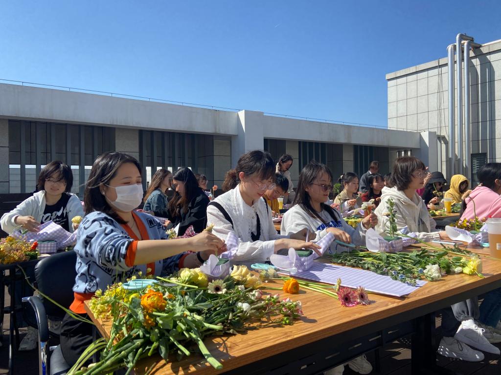 举办七彩油菜花插花活动,50余名师生共聚在三综七楼天台,赏花插花,共探油菜花多彩奥秘。叶沈华博士从观赏用途、改良机理等方面,向师生介绍团队科研成果,七彩油菜花不仅可以食用,还可以通过杂交获得高产多彩油菜花,获得更大经济效益。文静副教授认为,七彩油菜花作为花材极具观赏性,既可作为主花也可当做点缀使用,富有特色。“第一次用七彩油菜花插花,通过用七彩油菜插花来表达对自己、对生活、对植科的爱意,是属于植科人的浪漫。”文静说。