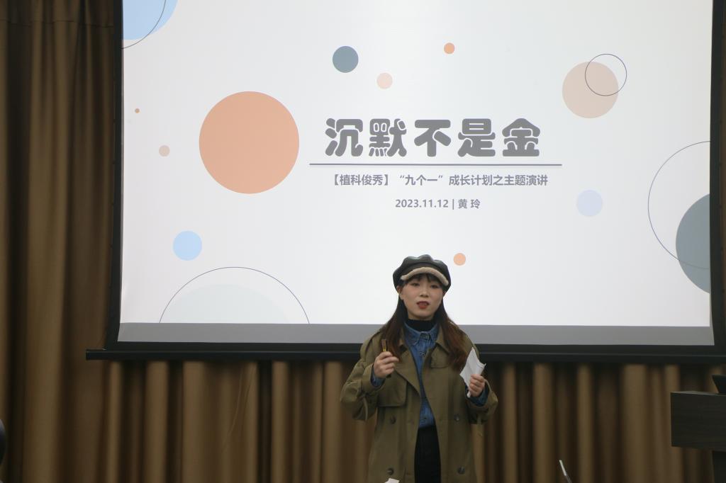 黄玲开展了题为《沉默不是金》的主题演讲,她从生活中的沉默、沉默的螺旋效应以及集体沉默带来的后果等方面告诉大家,沉默不是金,而是恐惧的残留物。她认为:沉默不仅是对个体机会的浪费,也是对社会公正的威胁。新时代的青年,更应具备独立思考的能力,敢于发声的勇气,和拒绝沉默表达自我的欲望。她呼吁大家要为正义和和平而努力发声。