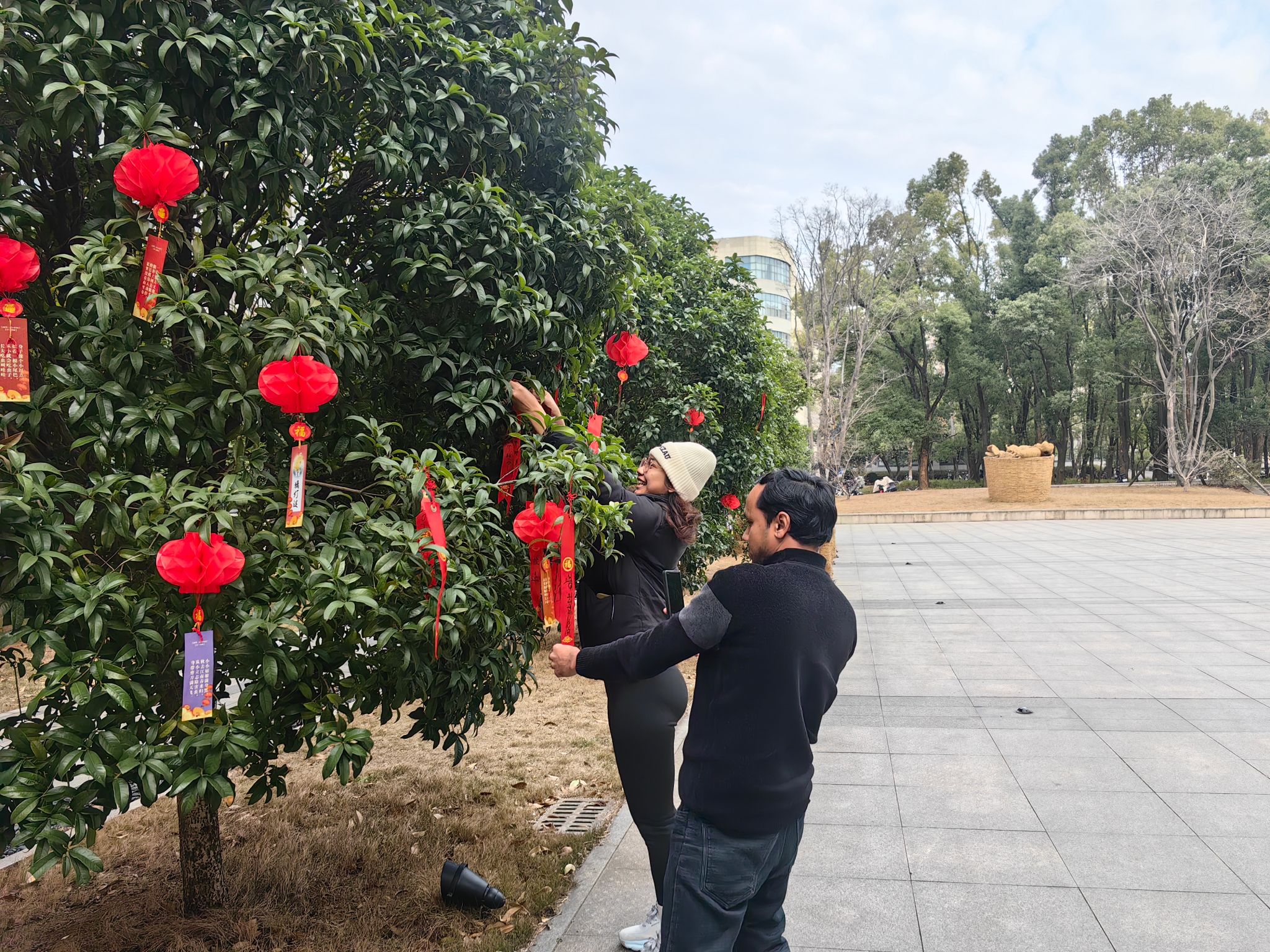 大年初二,在第三综合楼广场上,中外学生围在灯笼前猜灯谜、写祝福、抽红包,灯谜涵盖传统字谜、地理文化、历史故事等诸多领域,现场洋溢着欢快的节日氛围。“希望新的一年我们都可以得偿所愿。”抱着对新的一年的期许,同学们将写好的新年心愿系到树梢枝头,寄托对未来的无限憧憬。