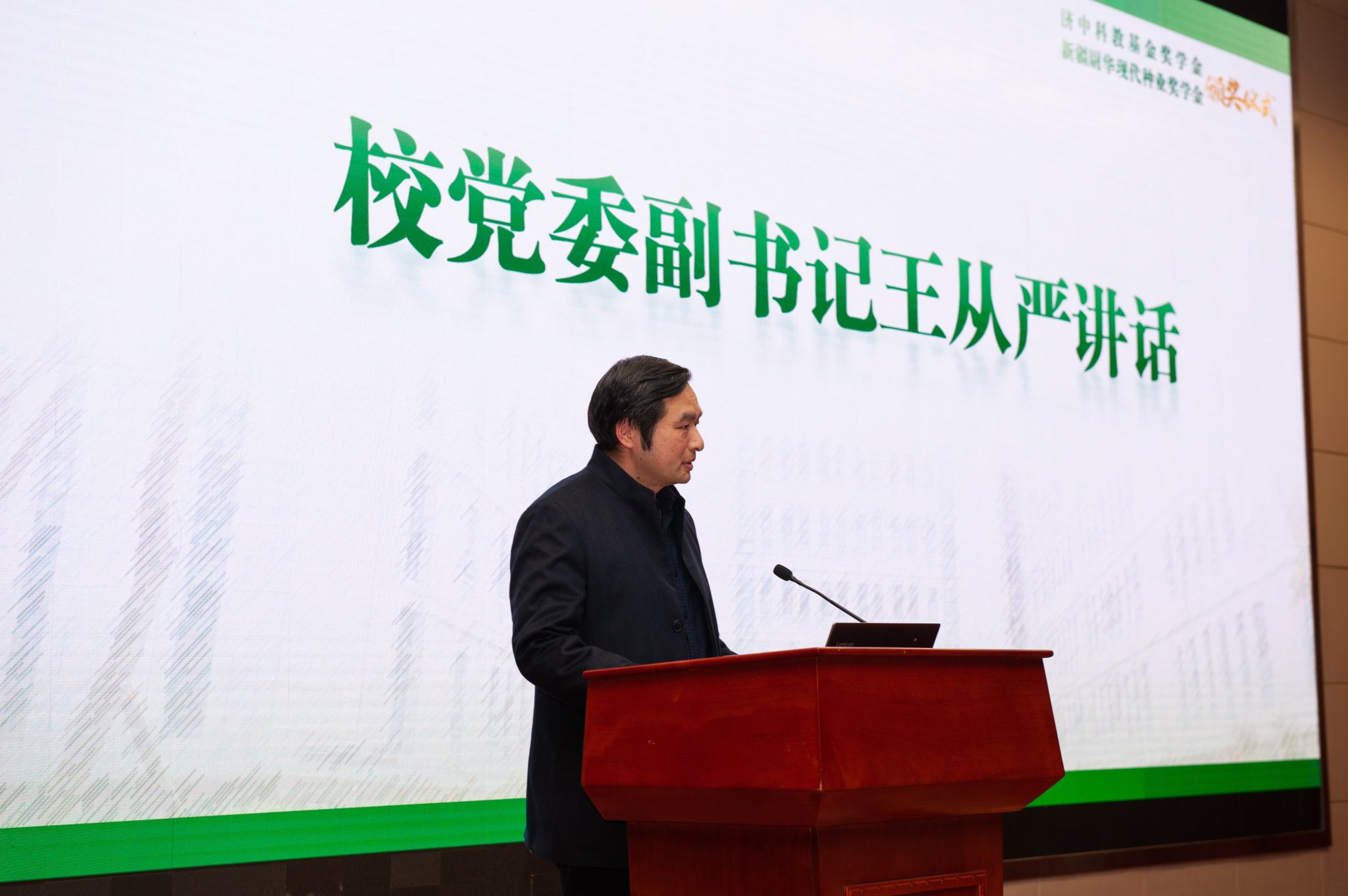王从严在讲话中表示,济中科教基金奖学金和新疆尉华现代种业奖学金的设立,承载着弘扬孙济中先生崇高精神的初心,三十余年间,张献龙老师带领团队不懈传承并弘扬孙济中等大先生的高尚情操,矢志不渝地追寻“衣被天下、温暖世界”的伟大梦想。王从严对华农青年学子提出三点期待:一要坚守“济世兴农”志向,勇担强国使命。二要秉持“融创致新”理念,勇攀科研高峰。三要践行“勤读力耕”品格,锤炼过硬本领,成长为富有家国情怀和全球胜任力的拔尖创新人才,努力把文章写在祖国大地上。