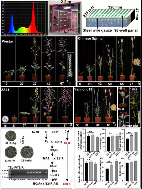 “快速育种技术”主要指通过人工控制光照(光周期、光照强度和光质构成)和温度环境,促进植物快速开花、快速成熟的一项综合技术。“快速育种技术”概念自2018年提出伊始,就立即受到包括作物育种者在内的植物科学工作者的高度关注。该研究基于人工控温控湿的温室条件,建立了一个红光、绿光和蓝光三基色光混合而成的LED照明光谱(三种光质的强度分别为60%,20%和20%),其在灯下10厘米处光通量密度高达950 μmol·m-2·s-1。在22小时光照/2小时黑暗的光周期和22-24℃的生长温度下,春性甘蓝型油菜品种“Westar”和小麦品种“中国春”可以分别在67天和75天内完成一个世代的生长。对于冬性甘蓝型油菜或小麦品系,则可将萌芽种子置于4.5℃条件下完成春化(具体时间依赖于不同品系的冬性强弱),再置于上述光照条件下培养。利用该方法,半冬性甘蓝型油菜品种“中双11号”和冬小麦品种“烟农19号”分别在87天和83天内完成一个生长世代,每个单株可分别收获800和20粒(去除分蘖)发育良好种子。此外还发现,如果在上述光谱中,额外添加500 μmol·m-2·s-1的远红光,则可在125天内完成强冬性甘蓝型油菜品种“Darmor-bzh”的一个生长世代,并能使“Westar”、“中双11”的生长周期进一步缩短至55天和66天。和2018年Watson报道的方法相比,本系统对于长日照作物而言,在处理效率、操作方便性和生长期缩短效果上均有大幅度的提升。