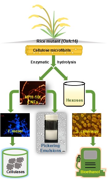 图1 水稻天然突变体纤维素纳米纤维作为皮克林乳化稳定剂与产酶诱导剂联产纤维乙醇模型图