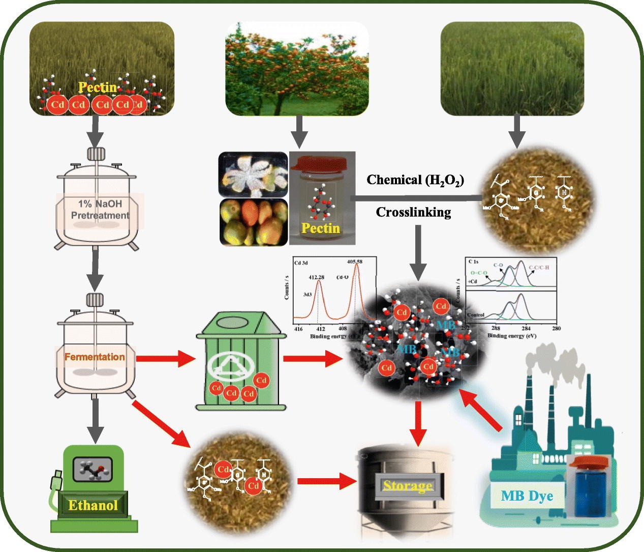Pectin is a minor wall polysaccharide with potential applications for bioproducts. Despite the application of specific plants and biomass-based sorbents for environmental remediation, little has been reported about characteristic roles of pectin. Using the natural rice mutant (Osfc16) treated with Cd, this study explored that pectin could predominately enhance Cd accumulation with lignocellulose, mainly due to remarkably raised uronic acids deposition. The Cd-treatment further reduced lignocellulose recalcitrance for significantly enhanced biomass saccharification and bioethanol production along with almost complete Cd release. Using all remaining fermentation rice residues that are of typical ribbon-structure and large surface, this study generated novel biosorbents by optimal chemical oxidation with the pectin extraction from citrus peels, and examined consistently raised Cd and methylene blue (MB) adsorption capacities. Therefore, this work has proposed a mechanism model about multiple pectin enrichment roles for Cd and MB removals in agricultural and industry locations with full lignocellulose utilization towards bioethanol production.