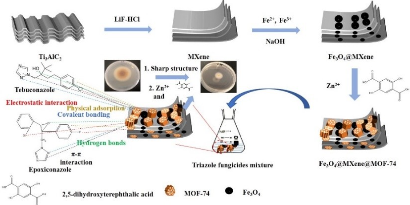 研究人员结合二维无机化合物MXene和金属有机骨架Zn-MOF-74合成了一种兼具吸附及抗菌能力的多功能磁性复合材料Fe3O4@MXene@MOF-74。经FT-IR,TEM,SEM,XRD,VSM,BET,TG等一系列表征分析,证实该材料具有稳定的化学结构,表面富含大量的官能团,可以快速分散在水环境中。基于该材料建立了稻田生态系统中4中三唑类杀菌剂多残留的去除方法,在取自三个省市的稻田水样加标实验中,对目标药剂去除效率高达90 %以上。重复利用性实验证实,该材料连续五次吸附-解吸循环后,仍可以保持稳定的结构,对目标杀菌剂仍具有较高的去除率。此外,在复合材料生物活性研究方面发现,该材料对稻瘟病菌病菌表现出明显的抑制作用,表明该材料对稻田常见病害的防治具有较好的潜力。该研究对稻田生态系统中农药残留净化去除以及多功能吸附剂的开发具有重要意义。