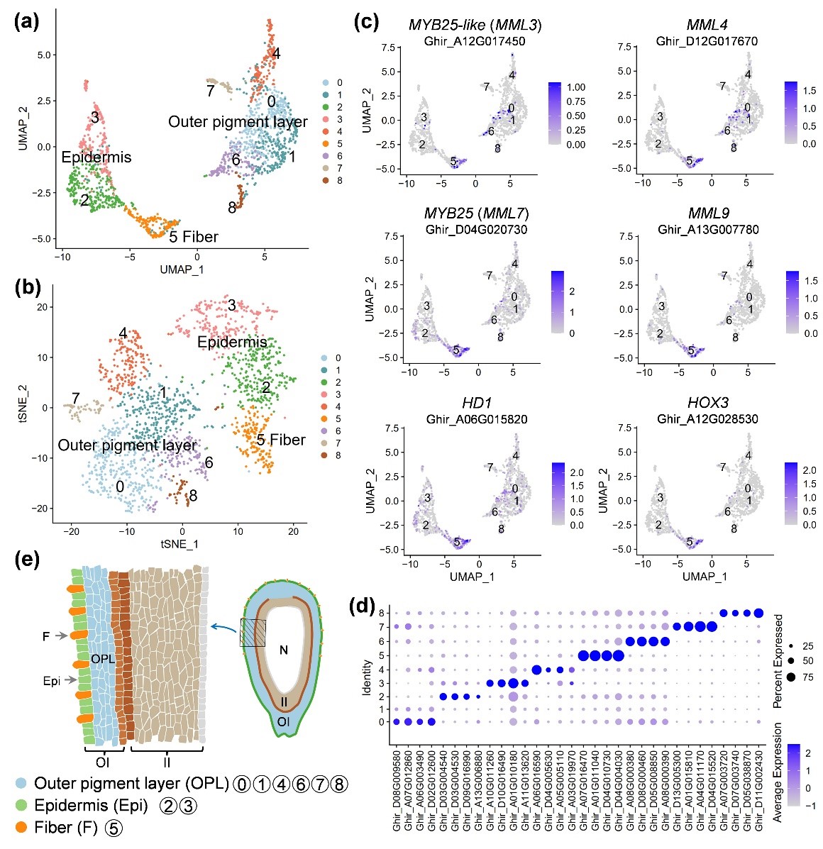 棉花遗传改良创新团队题为“Single-cell RNA-seq reveals fate determination control of an individual fiber cell initiation in cotton (Gossypium hirsutum)”的研究论文。这项工作首次在单细胞水平解析棉纤维分化起始调控网络及机制,提供了涵盖纤维细胞起始及早期伸长过程(纤维细胞分化、扩散生长和极性生长)的全基因组规模的基因表达图谱,并提出了单个纤维细胞早期发育的分子调控模型。