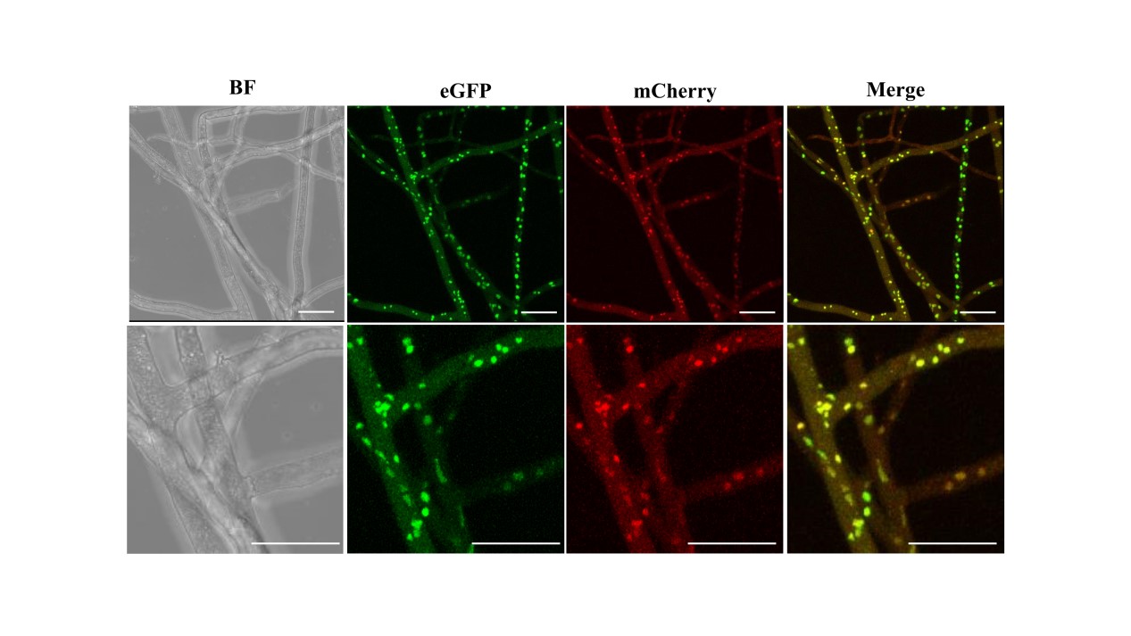 近期,应用真菌团队构建了两种细胞核荧光标记的重组载体,采用农杆菌介导的遗传转化方法,对梯棱羊肚菌两种交配型单孢菌株的细胞核进行荧光标记。结果显示绿色荧光蛋白eGFP和红色荧光蛋白mCherry均能在梯棱羊肚菌菌丝中稳定表达。将两种不同荧光蛋白标记的菌丝进行配对培养,观察到菌丝细胞融合形成异核体的现象。本研究为羊肚菌基础生物学及遗传学研究提供了关键技术方法,对开展羊肚菌基因功能研究和杂交育种具有重要意义。