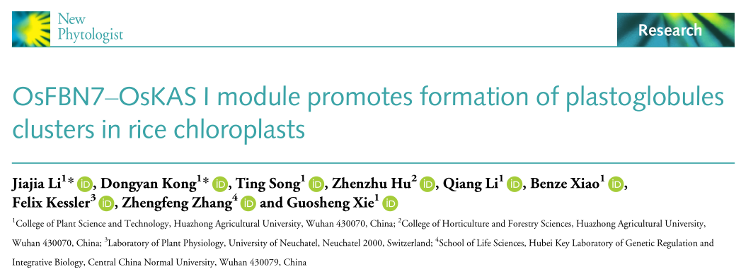 2023年6月27日,我院谢国生教授团队在《New Phytologist》发表了OsFBN7-OsKAS I module promotes formation of plastoglobules clusters in rice chloroplasts”的研究论文。该研究揭示了原纤维蛋白家族成员OsFBN7与叶绿体中脂肪酸从头合成关键酶OsKAS Ia/Ib互作,提高后者的酶蛋白丰度和稳定性,从而显著提高叶绿体中半乳糖脂(MGDG和DGGD)含量。最终,在水稻叶片叶绿体中促进葡萄串状质体小球(Plastoglobule,PG)的形成。该研究揭示了OsFBN7-OsKAS I模块在水稻叶绿体中半乳糖脂促进PG形成新机制中的作用。