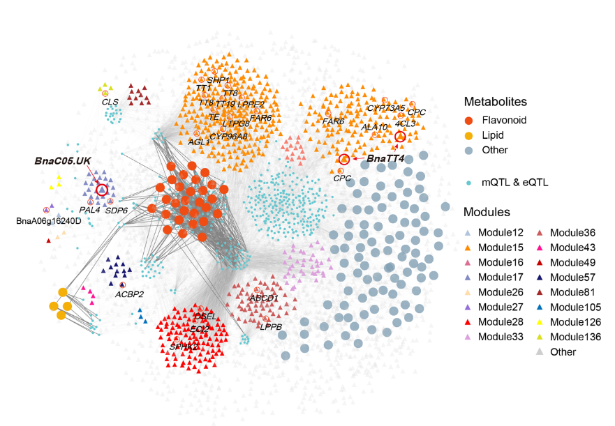该研究选择油菜成熟种子作为研究材料,采用广泛靶向代谢物分析的方法检测了2173种代谢物。通过分析鉴定了131个与含油量显著相关的代谢物,并将它们作为含油量的代谢标志物(marker metabolite)。对131个含油量代谢标志物开展了代谢物全基因组关联分析(mGWAS),定位到446个代谢物数量性状位点(mQTL)。同时,结合发育40天种子群体转录组数据,进行代谢物全转录组关联分析(mTWAS),鉴定到与含油量代谢标志物显著关联的7316个基因。结合这些基因的eQTL分析结果,构建了包括代谢物、QTL和基因之间的三元关系网络(图1)。