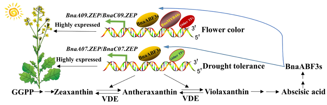 随后,启动子互换的遗传转化实验证明,启动子序列差异是导致BnaZEPs功能分化的决定因素。为发掘BnaZEPs上游调控因子,课题组利用酵母单杂、EMSA和Dual-LUC等技术,结合转基因和RNA-seq技术,筛选并证实了ABA响应因子BnaABF3s以及R2R3 MYB转录因子BnaMYB44s对BnaZEPs的差异调控:BnaABF3s可以直接激活BnaZEPs的四个同源拷贝的表达,在干旱胁迫下促进ABA的合成,从而提高油菜的耐旱性;而BnaMYB44s不靶向BnaA07.ZEP和BnaC07.ZEP,它特异抑制花瓣中BnaA09.ZEP和BnaC09.ZEP的转录,影响甘蓝型油菜花瓣中类胡萝卜素的组分变化,并抑制苯丙烷和类黄酮的生物合成。