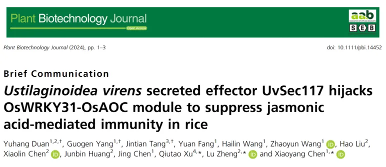 /安徽农业大学稻曲病研究团队在植物科学权威期刊《Plant Biotechnology Journal》上在线发表了题为“Ustilaginoidea virens secreted effector UvSec117 hijacks OsWRKY31-OsAOC module to suppress jasmonic acid-mediated immunity in rice”的研究论文,鉴定到一个调控稻曲病抗性的水稻转录模块OsWRKY31-OsAOC,并发现了稻曲菌效应蛋白可劫持OsWRKY31-OsAOC模块抑制水稻茉莉酸介导的免疫响应,进而促进稻曲菌侵染。