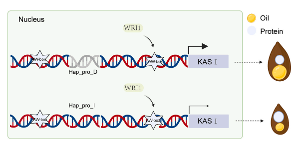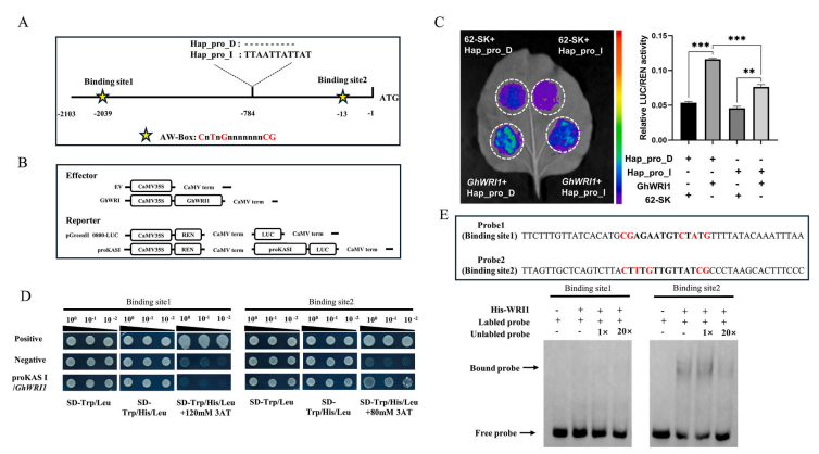 根据已有报道,植物AP2/EREBP家族转录因子WRINKLED1(WRI1)调节种子油的积累,为了鉴定调节GhKAS1_A05的关键调节因子,本研究筛选了一个在棉花种胚发育时期优势表达的GhWRI1基因,并通过LUC、Y1H以及EMSA互作分析,证明了GhWRI1蛋白可以直接与GhKASI_A05启动子上的AW-box顺式调控元件结合,激活GhKASI_A05的表达,并且该蛋白对11bp缺失的单倍型GhKASI_A05启动子的激活能力强于11bp插入的单倍型。
