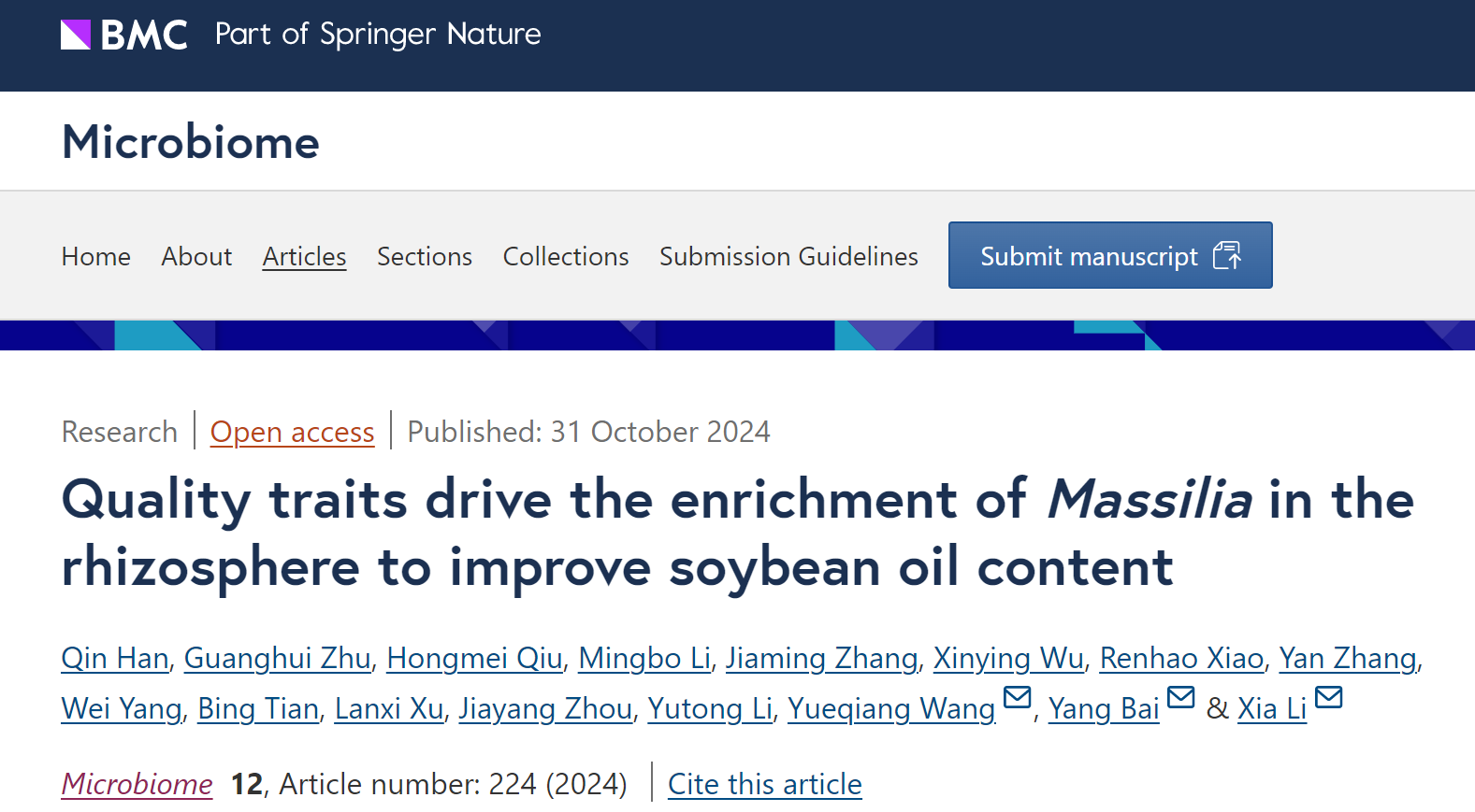 大豆团队联合中科院遗传发育所和吉林省农科院在微生物组领域国际权威期刊《Microbiome》(2023年影响因子:13.8)在线发表了题为“Quality traits drive the enrichment of Massilia in the rhizosphere to improve soybean oil content”的重要研究论文,研究发现了一类与大豆油脂相关的微生物(Oil Associated Bacteria, OAB)并证明特定微生物马赛菌(Massilia)在大豆根际的富集能够促进根系生长并显著提升大豆油脂含量,这一发现为提高大豆油脂含量及品质改良提供了新思路。