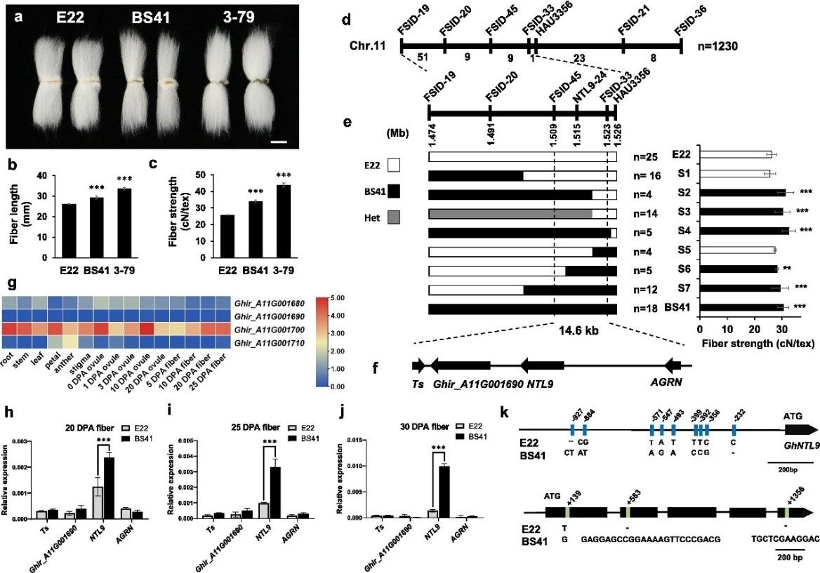 林忠旭教授课题组在《Journal of Advanced Research》杂志发表了题为“NAC transcription factor GbNTL9 modifies the accumulation and organization of cellulose microfibrils to enhance cotton fiber strength”的研究论文。该研究从陆地棉鄂棉22(E22)和海岛棉3-79回交自交系BIL群体中筛选到一个纤维品质优良的家系,命名为BS41。以陆地棉E22和BS41为亲本的分离群体,图位克隆了一个控制纤维强度的NAC转录因子GbNTL9(图1)。