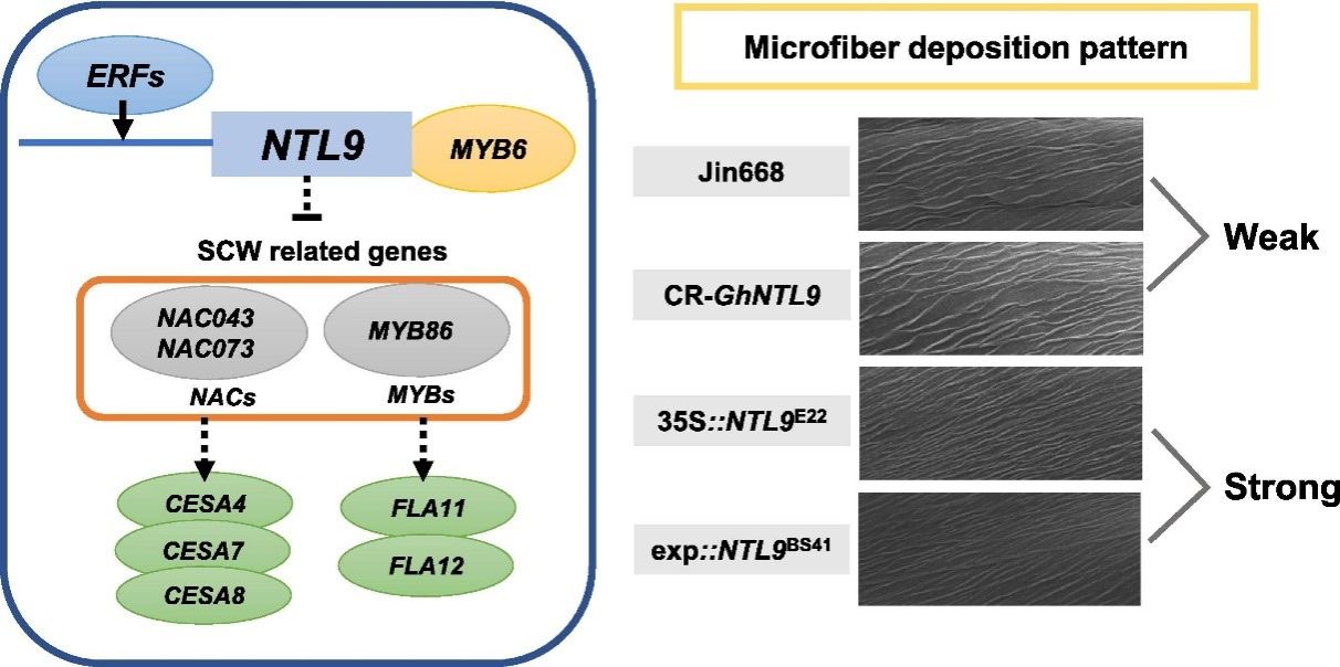 进一步研究发现,NTL9通过促进纤维素微纤维在细胞壁上的紧密堆积排列来增加纤维强度(图3)。转录组分析表明NTL9抑制了一系列次生壁合成相关基因(如CESA4、CESA7和CESA8等)的表达,这种纤维素的延缓合成可能改变了纤维素微纤维的沉积模式,从而提高纤维强度。NTL9与MYB6在体内存在物理相互作用,且NTL9是ERF转录因子(GhERF5,GhERF7,GhERF9,GhERF12)的下游靶标,可能通过乙烯信号途径参与纤维强度的调控(图4)。此外,作者还发现NTL9基因第二个外显子上的一个24-bp插入型InDel为海岛棉所特有,且对纤维强度有正向效应。基于该InDel,作者开发了一种能够有效区分陆地棉和海岛棉基因型的分子标记,为分子标记辅助选择育种提供了实用工具。综上所述,该研究不仅为棉花纤维品质的遗传改良提供了重要的基因资源,还为解析纤维强度的遗传调控机制提供了新的理论依据。