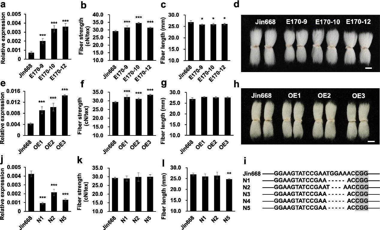 图2. NTL9转基因系(35S::NTL9E22,exp::NTL9BS41和CRISPR GhNTL9)的表达分析与纤维表型