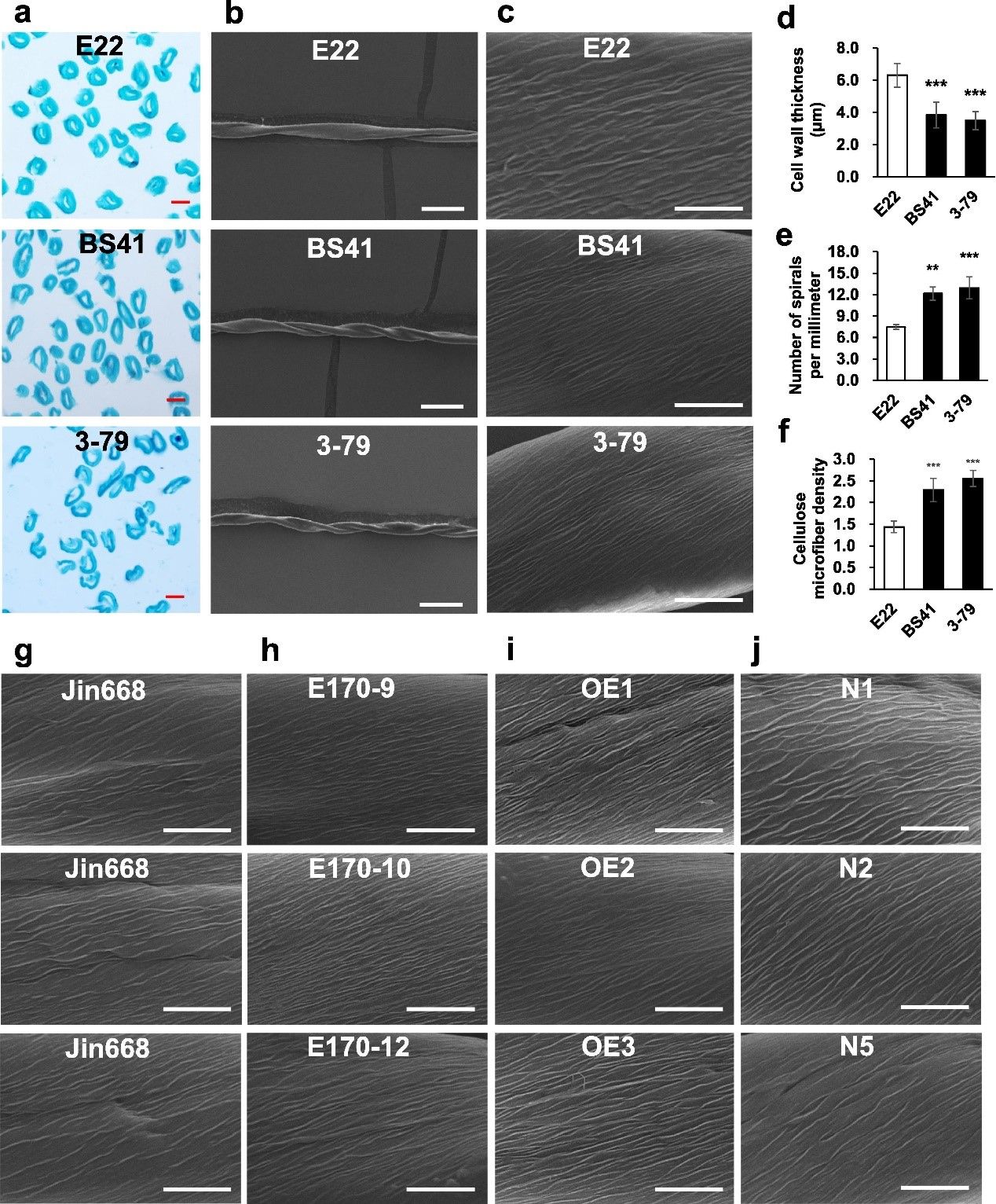 图3. 亲本和转基因系纤维细胞壁形态结构