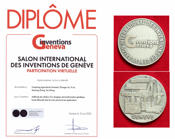 近日,第50届日内瓦国际发明展对外公布获奖名单,我院棉花遗传改良团队林忠旭教授的研究成果《A method for creating high efficiency genetic transformation receptor in upland cotton and it's applications》荣获银奖。该发明为棉花的遗传转化及基因功能研究拓展了陆地棉基因型种质资源。