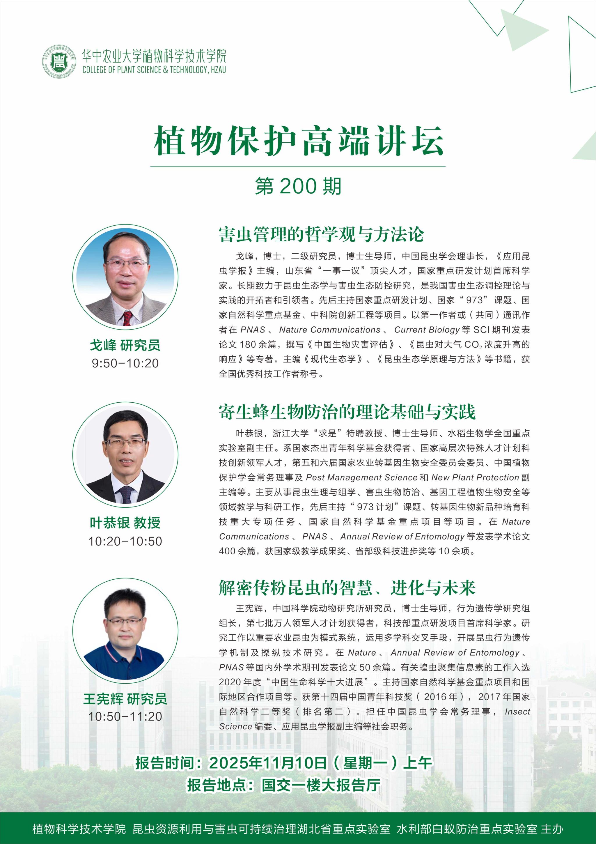 害虫管理的哲学观与方法论(戈峰 研究员)/寄生蜂生物防治的理论基础与实践(叶恭银 教授)/解密传粉昆虫的智慧、进化与未来(王宪辉 研究员)
