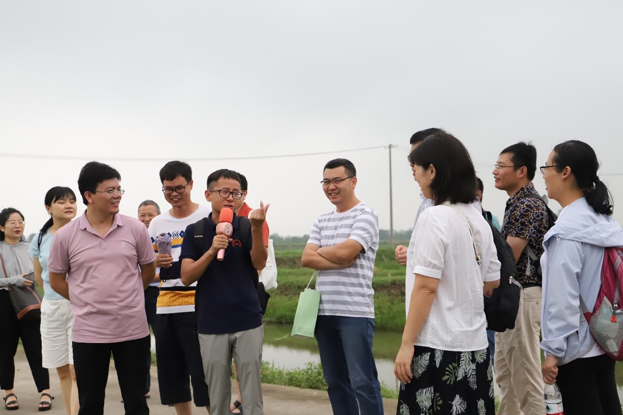 提倡的“双水双绿”模式,在稻田种养的过程中实现“绿色水稻”和“绿色水产”的协调发展,为做大做强水稻、水产“双水产业”,解决三农问题、实现乡村振兴贡献力量。农业生态团队江洋副教授详细介绍了基地的功能划分与管理情况。参观过程中,党员们感叹于学科交叉融合的飞速发展以及基地建设的现代化与智能化,热烈地讨论了“双水双绿”模式中水稻种植与水产养殖协调发展的相关问题。