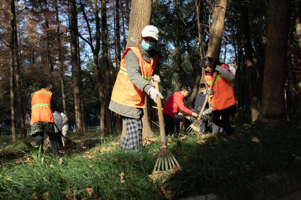 工作人员现场分配好劳动工具后,支部成员与环卫工人一同前往国际学术交流中心路边草坪,清理夹杂在草丛中的落叶。“使用草耙时,要尽可能地让其与地面水平,这样才不会造成较大的阻力,提高效率的同时还可以减少工具的损坏。”一位经验丰富的阿姨耐心地为同学们做起了示范,直起身时,不禁揉了揉发酸的腰,并继续讲解。支部成员也有样学样地耙起草,尝试着将枯黄的树叶翻出来,最后协力与环卫工人一同完成了责任区域的枯枝落叶的清理。