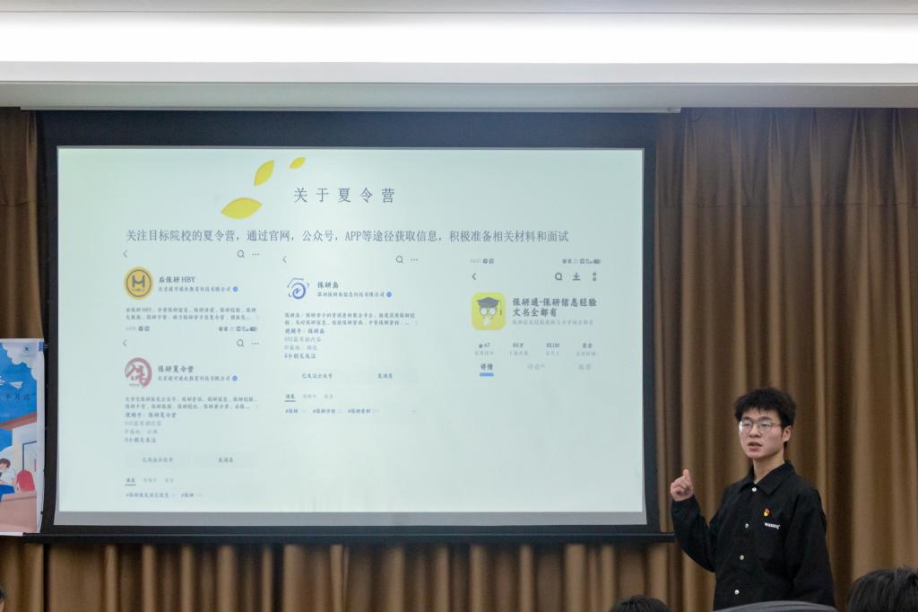 沿着时间轴行进到中点,余闯认为此时是为夏令营和推免做准备的重要时期。“大家可以通过官网,公众号,APP等途径获取目标院校夏令营信息,积极准备相关材料和面试。”在回忆自己保研之路时,他分享了自己二战四六级,努力获得优异成绩的经历。他鼓励大家在任何情况下都不要气馁,遇到困难时勇于面对,积极解决。