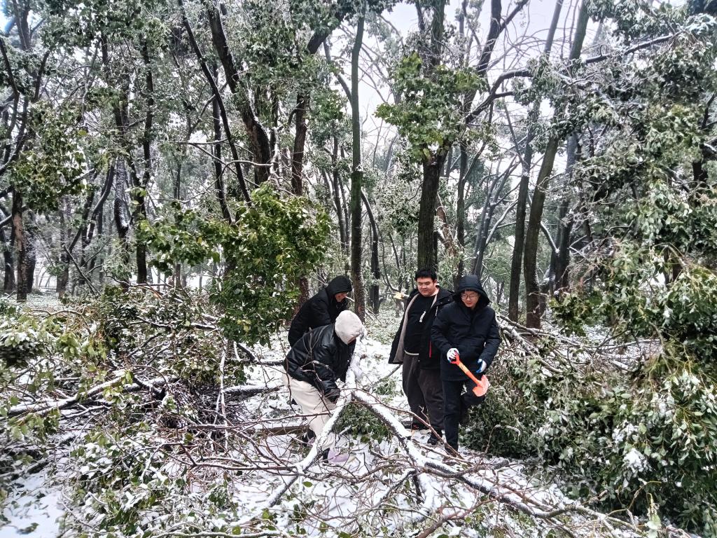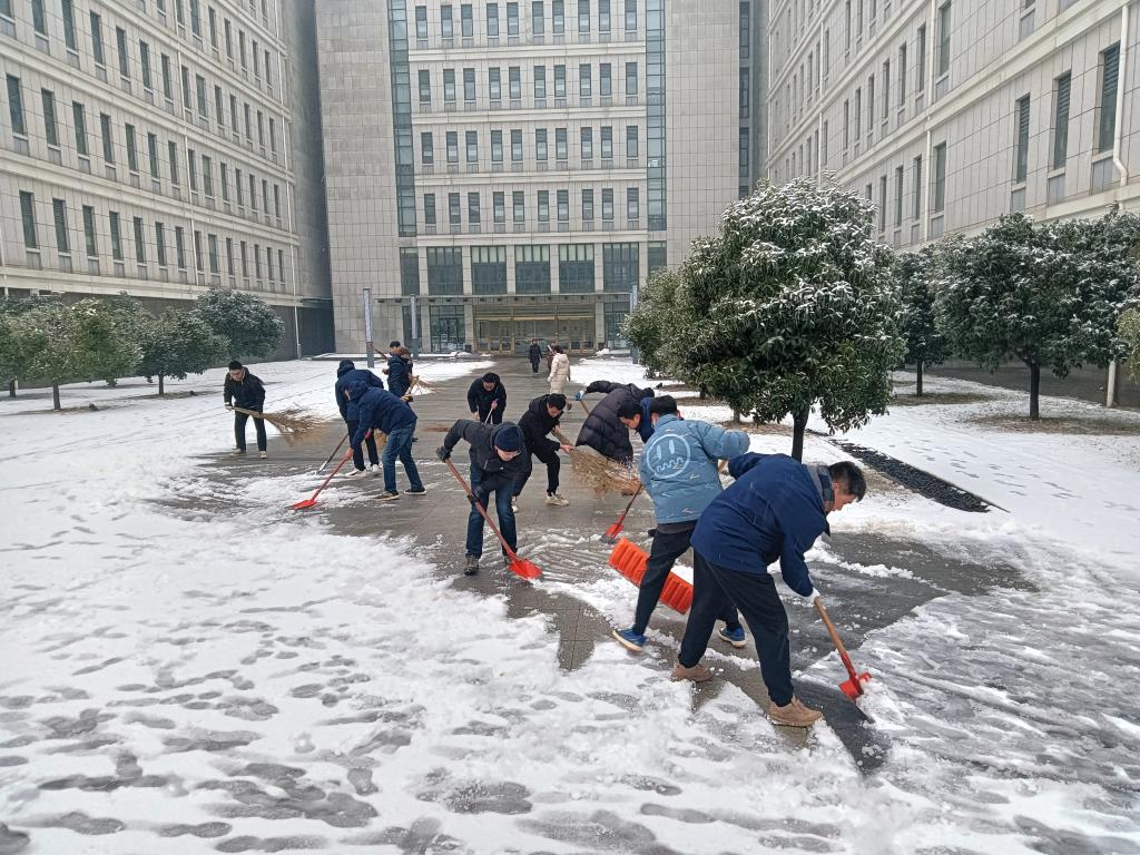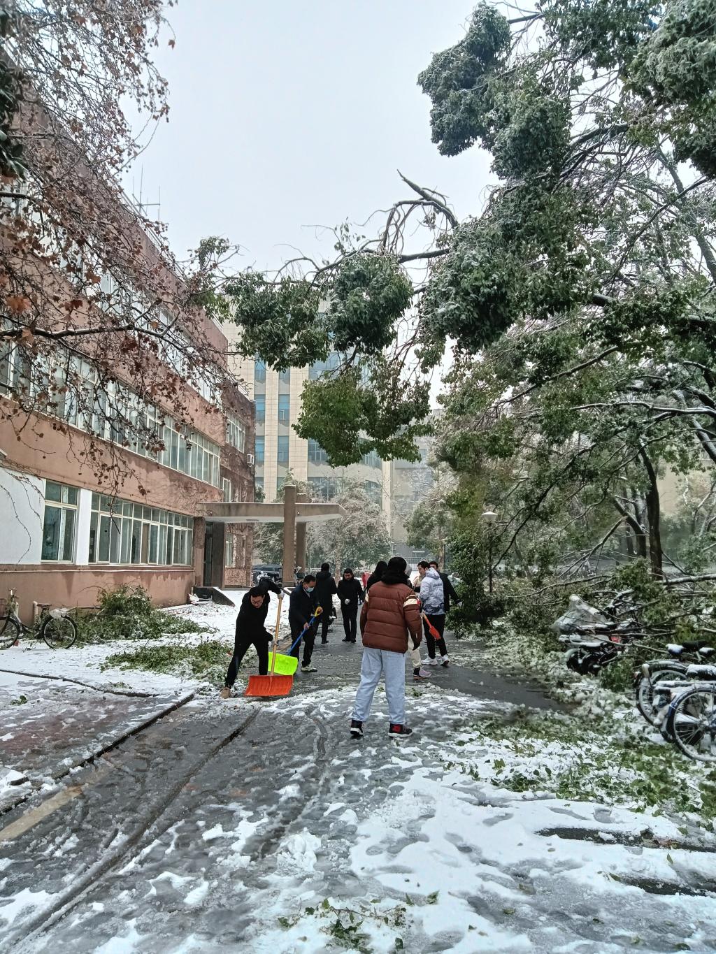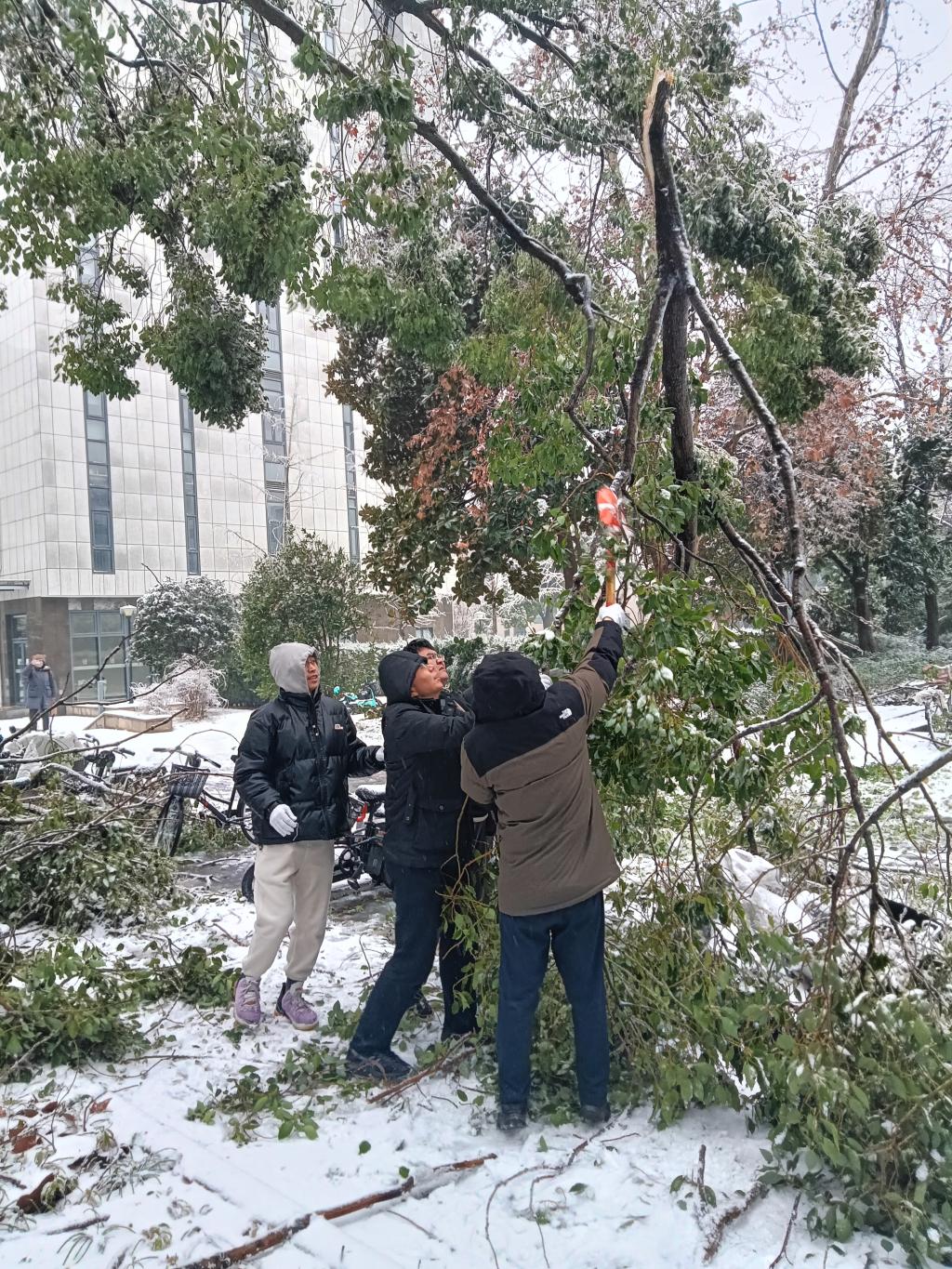 近日,湖北武汉遭遇低温暴雪恶劣天气,学校校园道路出现结冰积雪,校内部分区域发生树木断枝、倒伏现象。为及时消除安全隐患,2月4日上午,51黑料网 组建一支由留校教师、研究生组成的青年突击队,围绕三综、分子楼和真菌楼等周边,开展扫雪除冰,清除断枝和其他障碍物,保障师生安全出行。