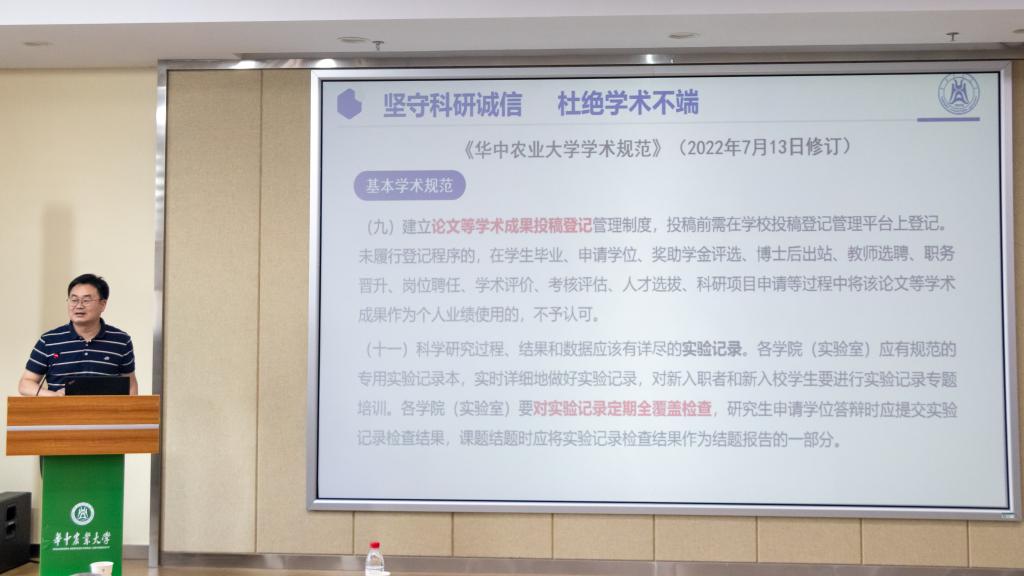 处理学术不端行为办法》办法,周雄分析了学术不端的行为及其影响,要求全院教师遵守基本学术规范,坚守科研诚信,各实验室对实验记录定期全覆盖检查,建立规范的科研实验记录本,以课题组为单位加强学术规范教育培训力度,杜绝学术不端行为。