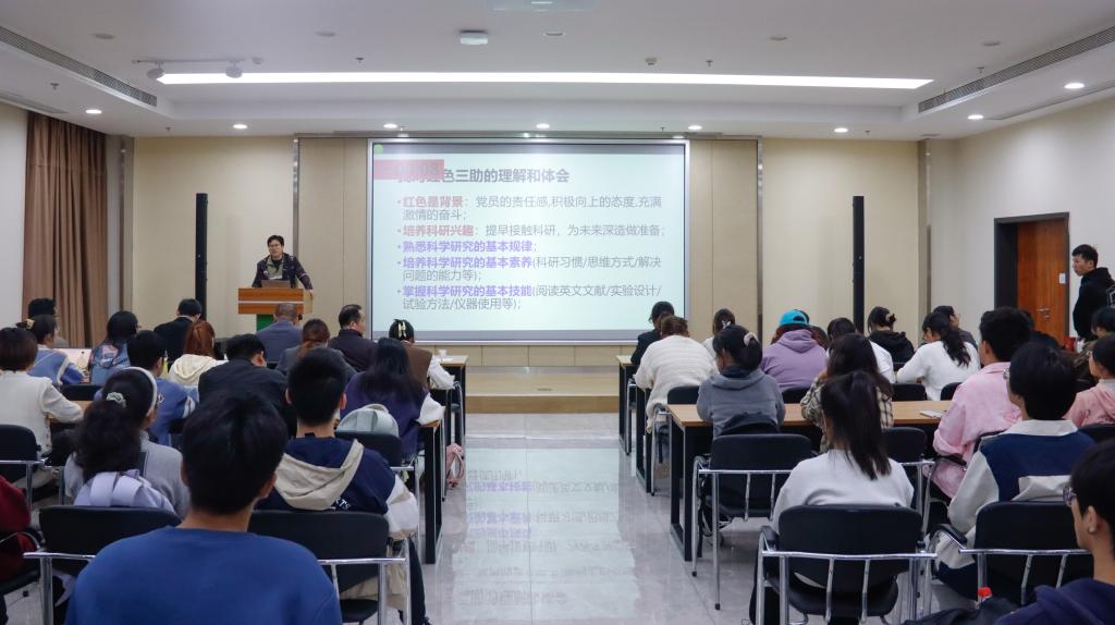 会议伊始,陈小林以“如何做科研和科研笔记”为主题展开,解释了自己对“红色三助”计划的理解与感悟,指出该计划旨在发挥党员的先锋模范作用,引领同学们尽早接触科研领域,为未来深造奠定坚实基础。随后,陈小林展示了科研记录本的正确记录方法,鼓励参与“红色三助”计划的同学们要科学规划时间、培养良好习惯、勇于面对失败,不断积累经验。