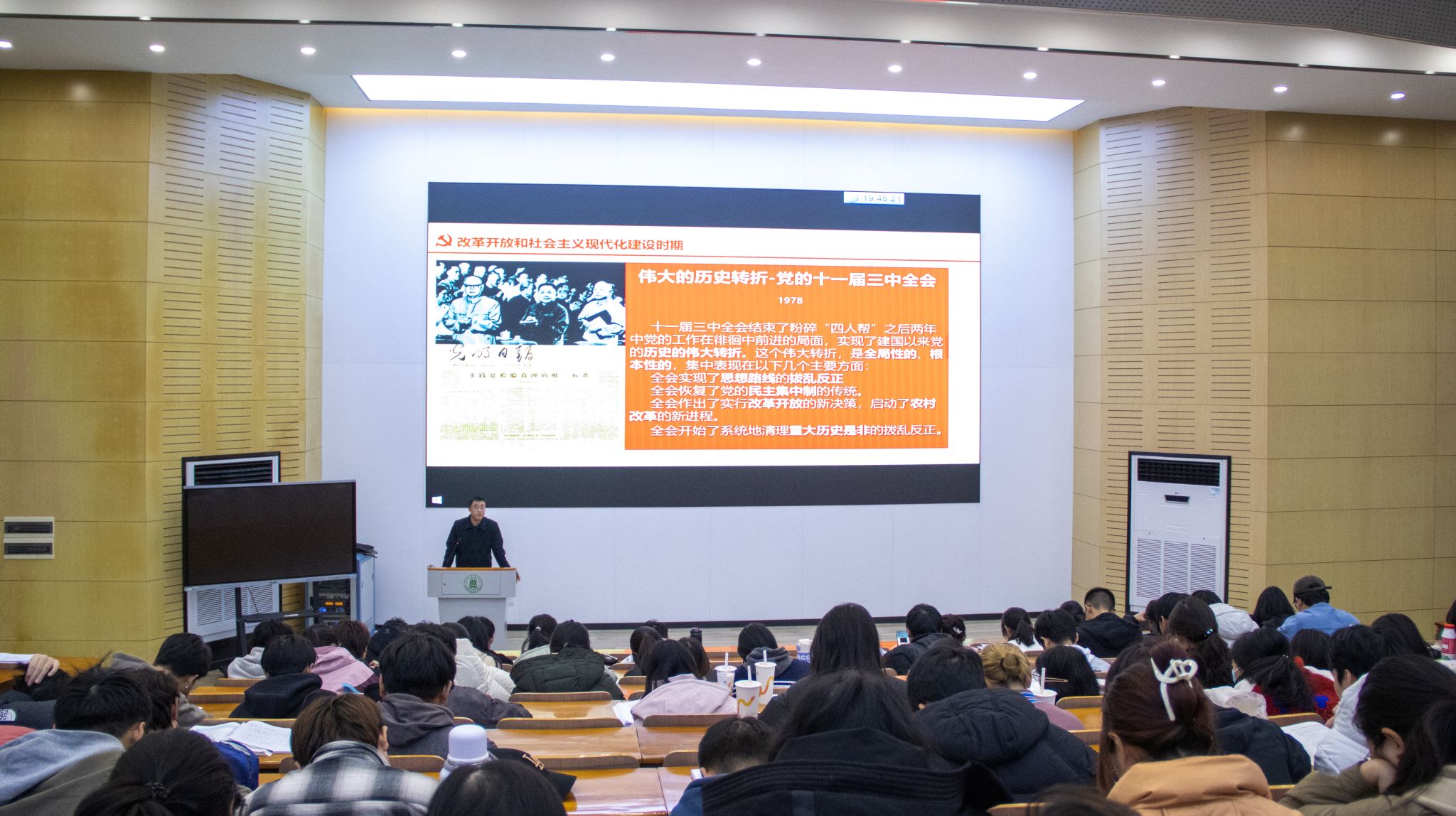 从南湖红船到井冈山,从南昌起义到全民抗战,练人杰以史为鉴,讲述中国从站起来到富起来,再到强起来的峥嵘历程。“历史是最好的教科书、营养剂、清醒剂,”练人杰向同学们提到,”我们要深刻认识学习党史、新中国史、改革开放史、社会主义发展史的重大现实意义,全面了解中国共产党在其中所做出的伟大历史贡献。”最后,练人杰鼓励同学们学习经典、积极探求规律、涵养智慧,提升自我。