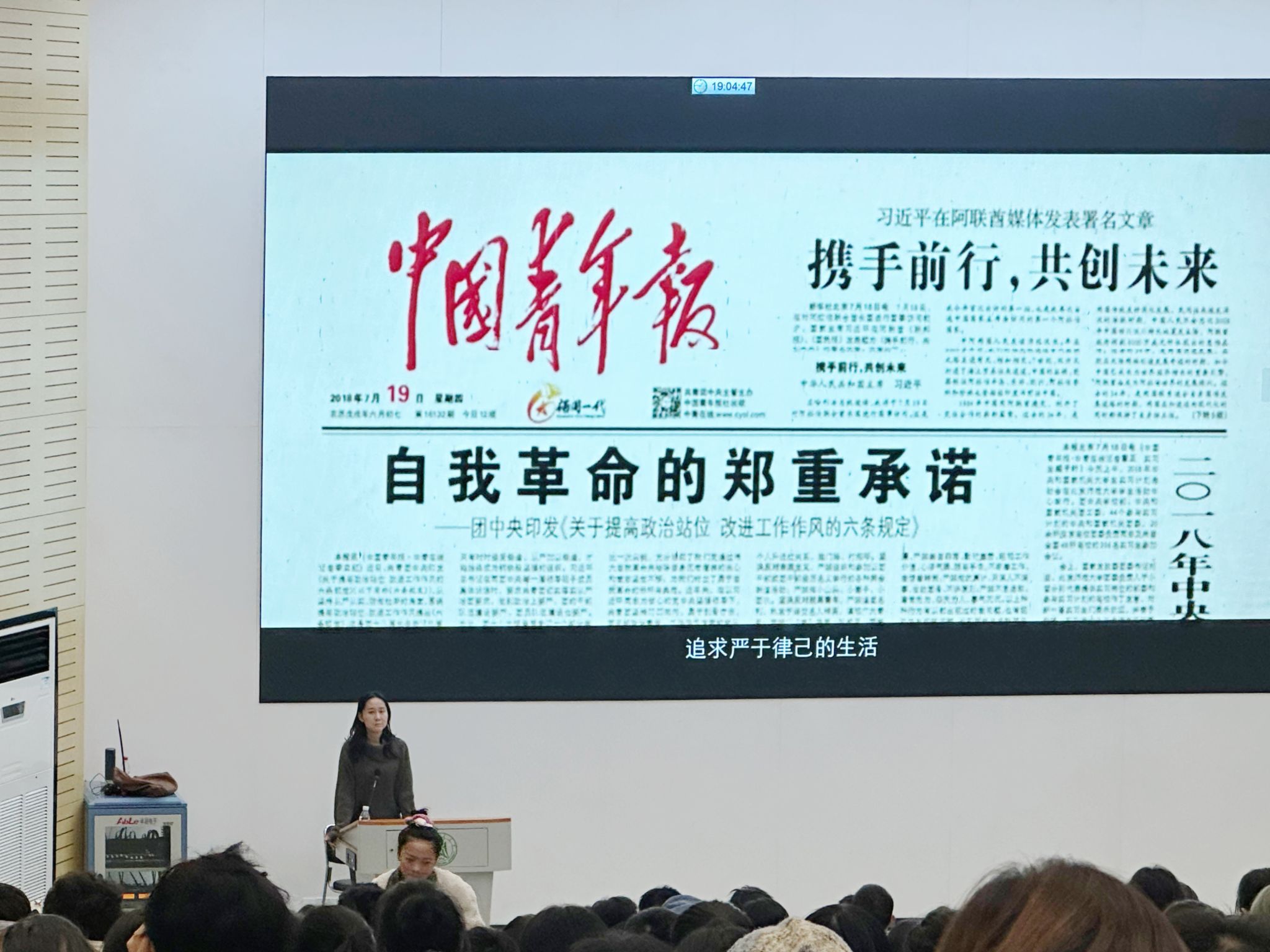 “在场是否有团员同学?”“是否有今年加入团组织的同学?”“中国共产主义青年团的章程是什么?”“为什么要学习团章?”课程伊始,周诚晨以四个问题为引,为同学们解读中国共产主义青年团的基本章程,并强调团员应该履行的责任与义务。周诚晨通过本校优秀团员故事,鼓励大家汲取榜样力量,与祖国同行,为人民奉献。