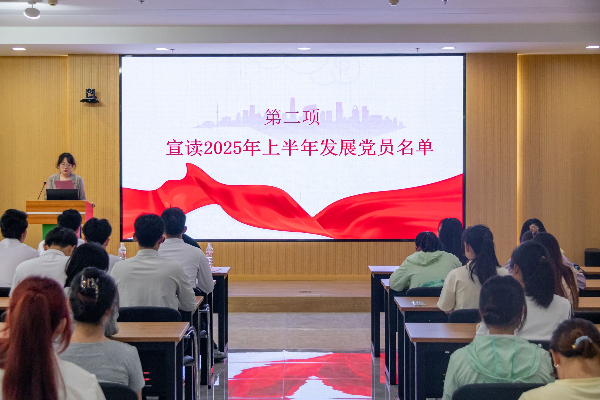 随后,党员代表为新发展党员佩戴党员徽章,传递党员力量,筑牢初心使命。新发展党员代表李雅欣上台发言。她深知今日的荣誉离不开党组织的培养与信任,将在今后的学习、工作和生活中,以党员标准严格要求自己,不断提高自身素质,为党和人民的事业贡献自己的力量。
