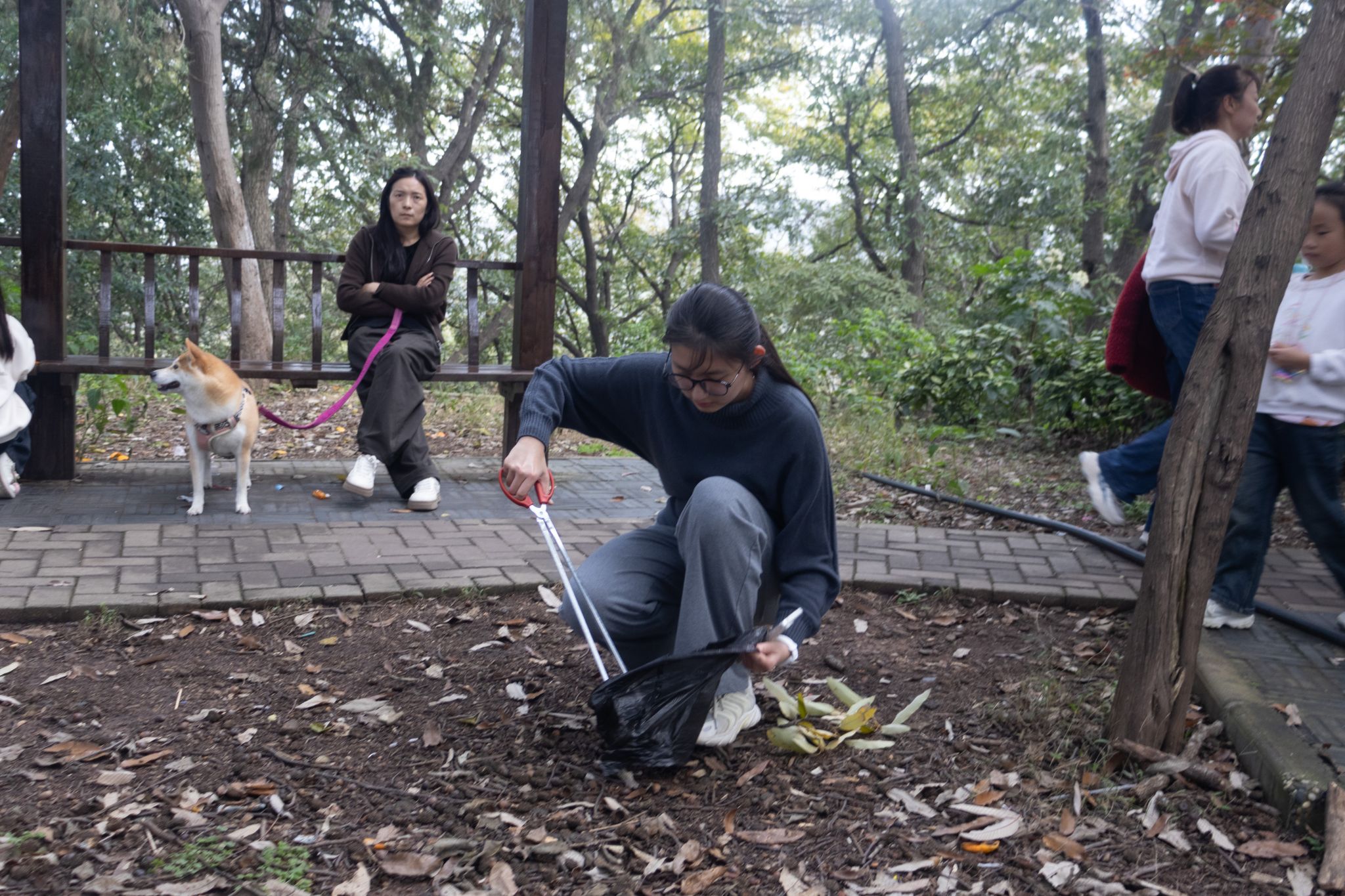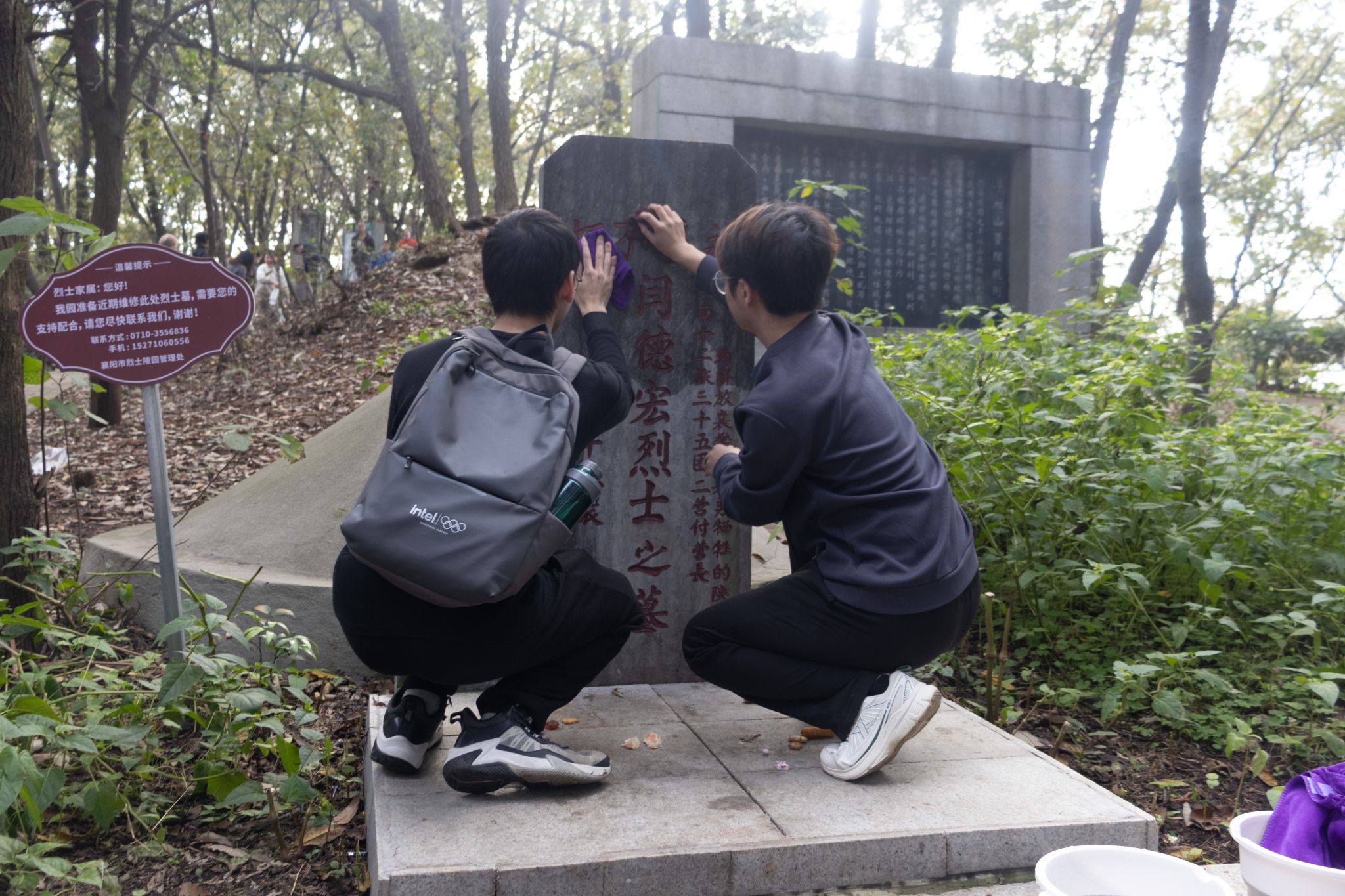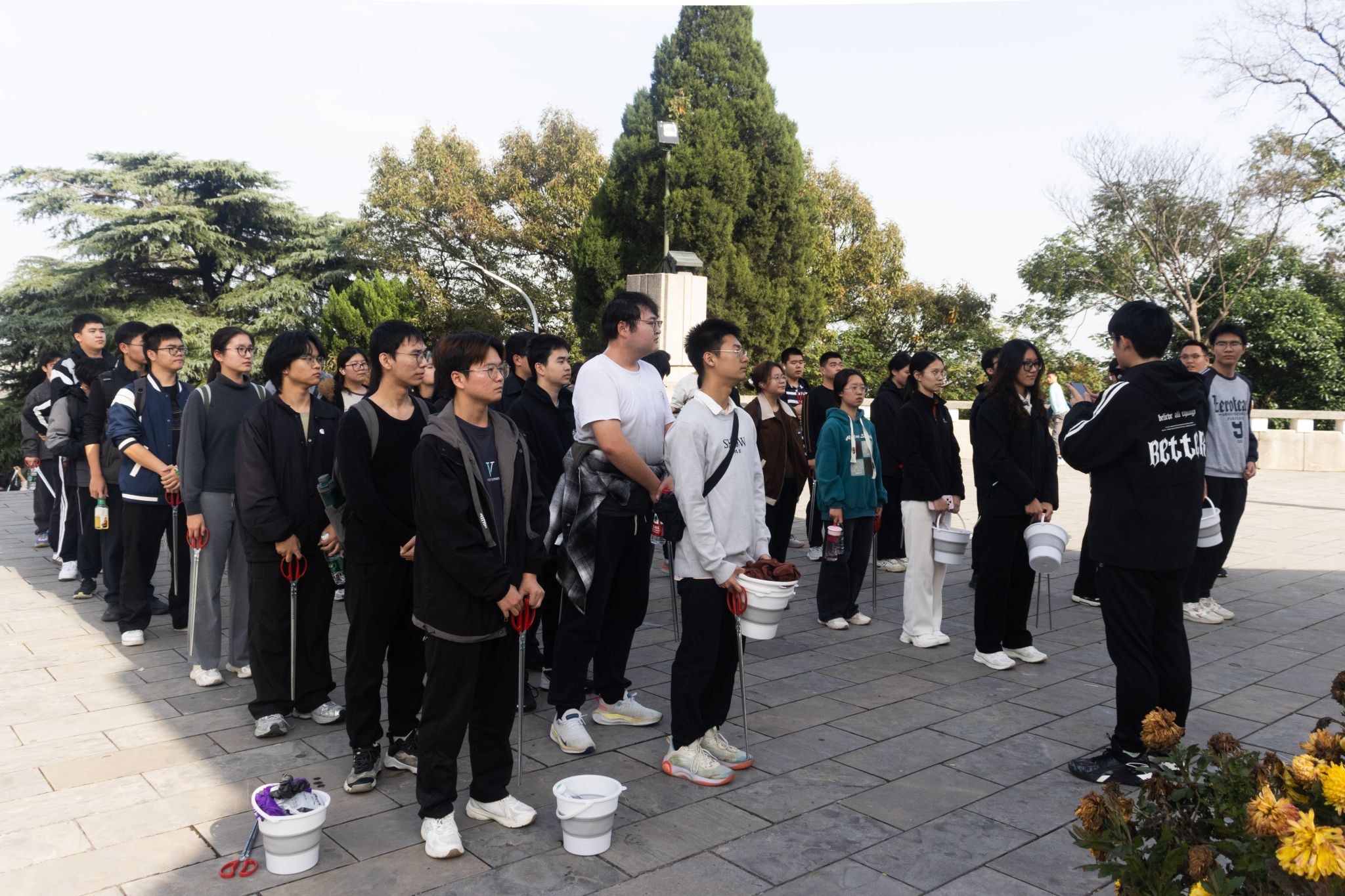 午后的襄阳市烈士陵园松柏凝翠,秋风肃穆。50余名青年学子手持铁夹、抹布等工具,俯身清扫落叶、擦拭墓碑。铁夹夹起枯枝的清脆声响、抹布拂过碑文的细微摩擦声,与松涛共鸣成一曲无声的致敬礼赞。从台阶缝隙的塑料碎屑到碑座旁的杂草枯枝,从围栏浮尘到纪念碑基座污渍,每一处细节的清理不仅是对英烈安息环境的净化,更成为青年学子与历史对话的特殊方式。