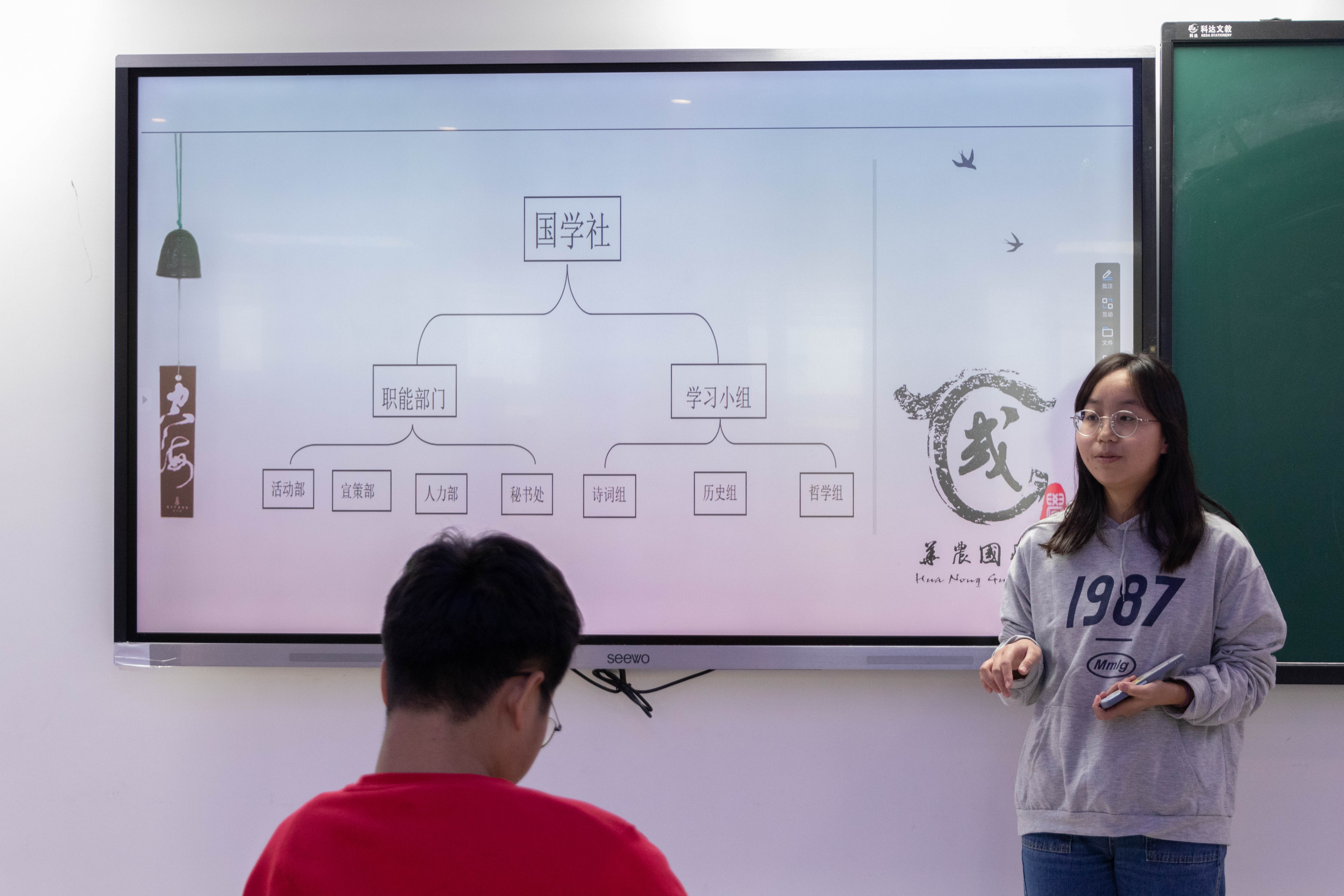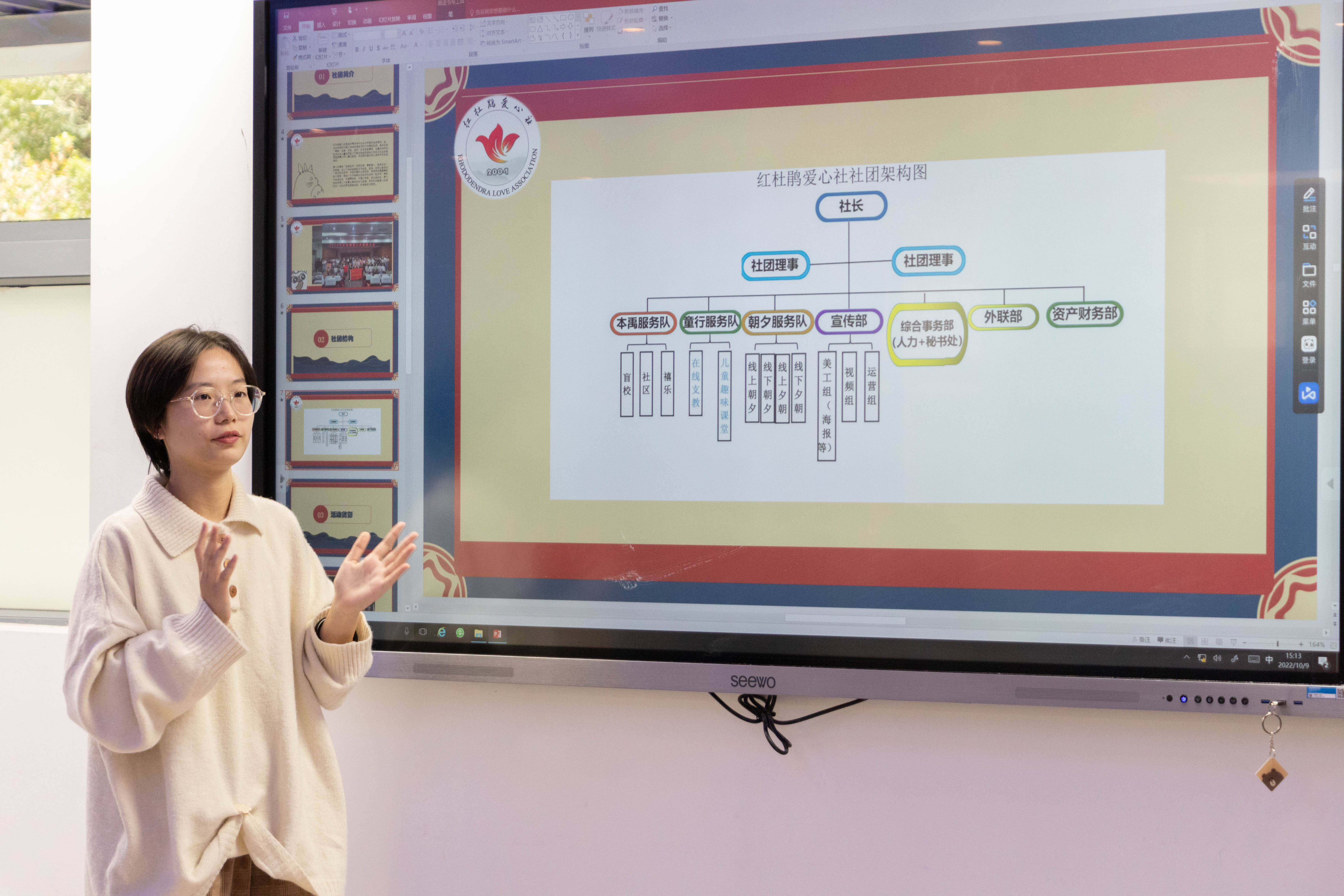 开班仪式上张馨丹面向报名同学介绍了兴趣小组的设立初衷和活动申报流程,随后来自国学社、绿色协会、红杜鹃爱心社的三位负责人依次介绍了社团活动组织的相关经验。