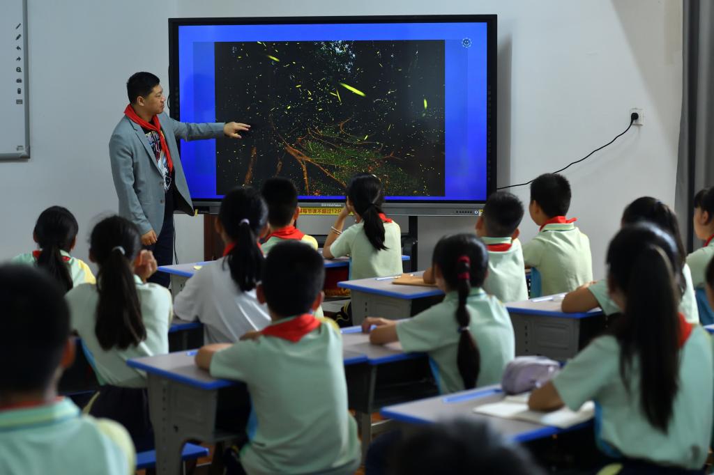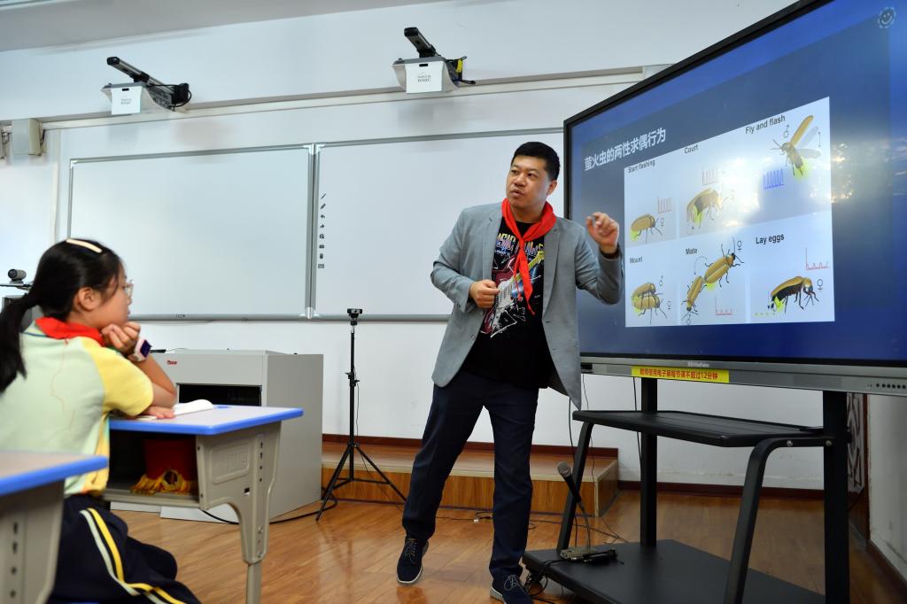 9月23日上午,付新华以“萤火虫的奥秘”为题,开启公益讲座第一课。“见过萤火虫的同学请举手”,付新华与同学们亲切互动,他引用李时珍“一种水萤,居水中”描述,向同学们介绍了水栖萤火虫黄缘萤的生活史;通过讲述蜘蛛与萤火虫的故事,分享了跨物种的神奇诱捕现象;通过历史文化与照片赏析,引导同学们发现自然界之美。“老师,萤火虫怎么吃蜗牛呢”“萤火虫同性之间可以交流吗”“萤火虫可以跨物种交流吗”......课后小朋友们踊跃提问,付新华“以例说法”为同学们详细解答并鼓励同学们:“希望大家在明亮的灯光下学习之余,能够到“有光”的地方仰望星空,种下梦想的‘种子’”。